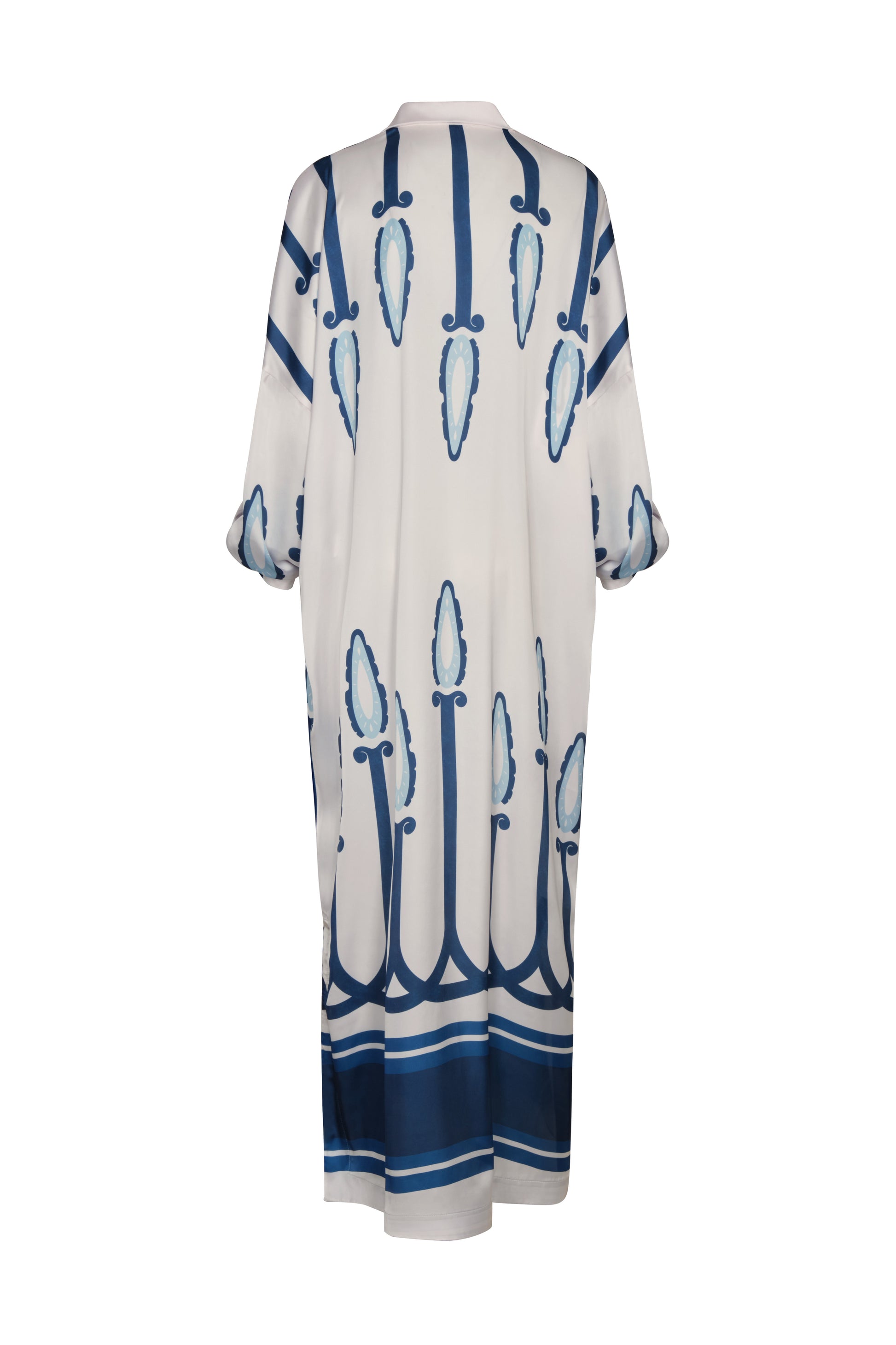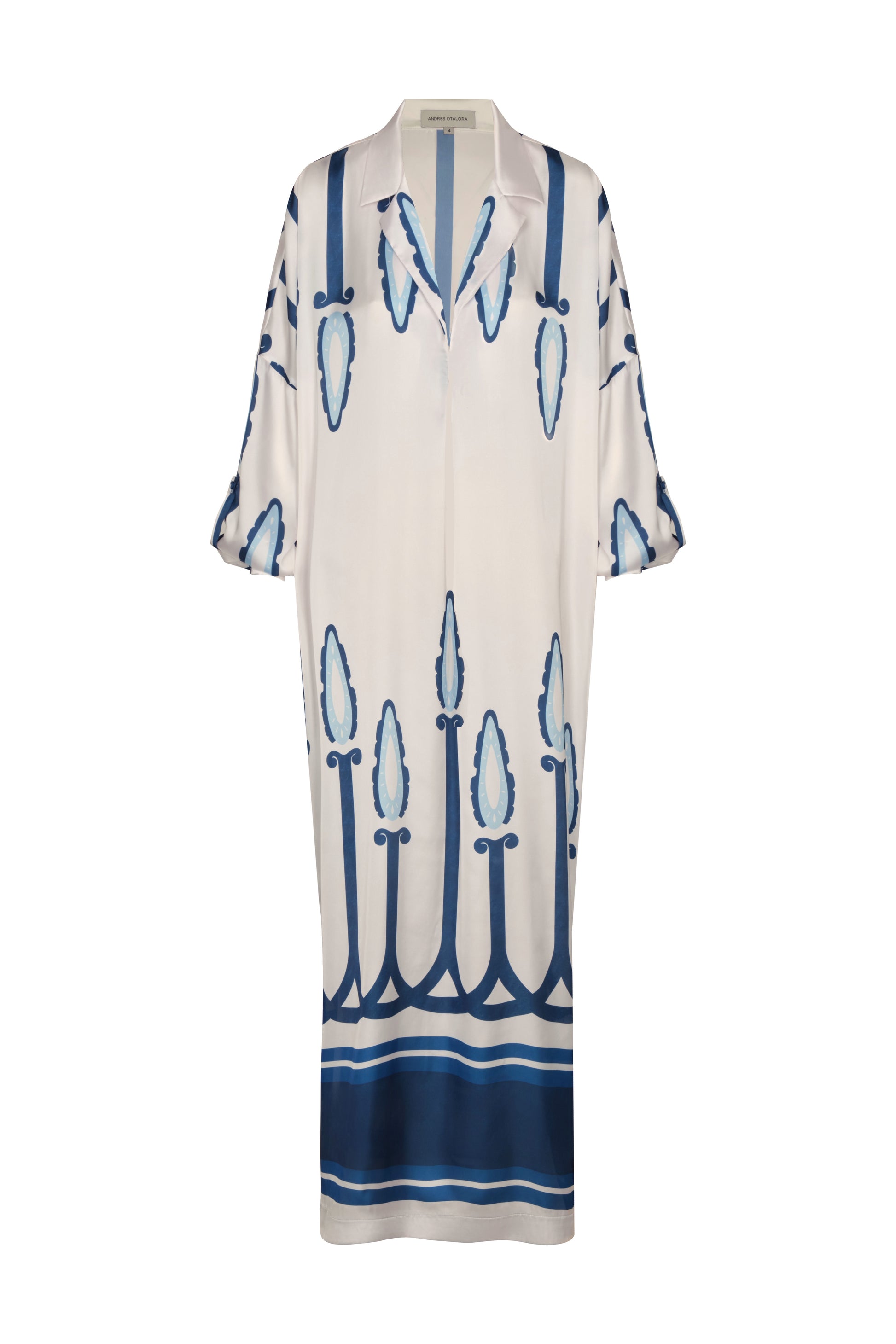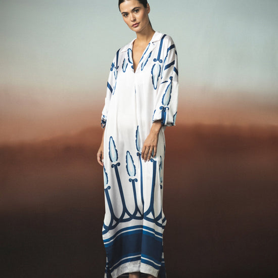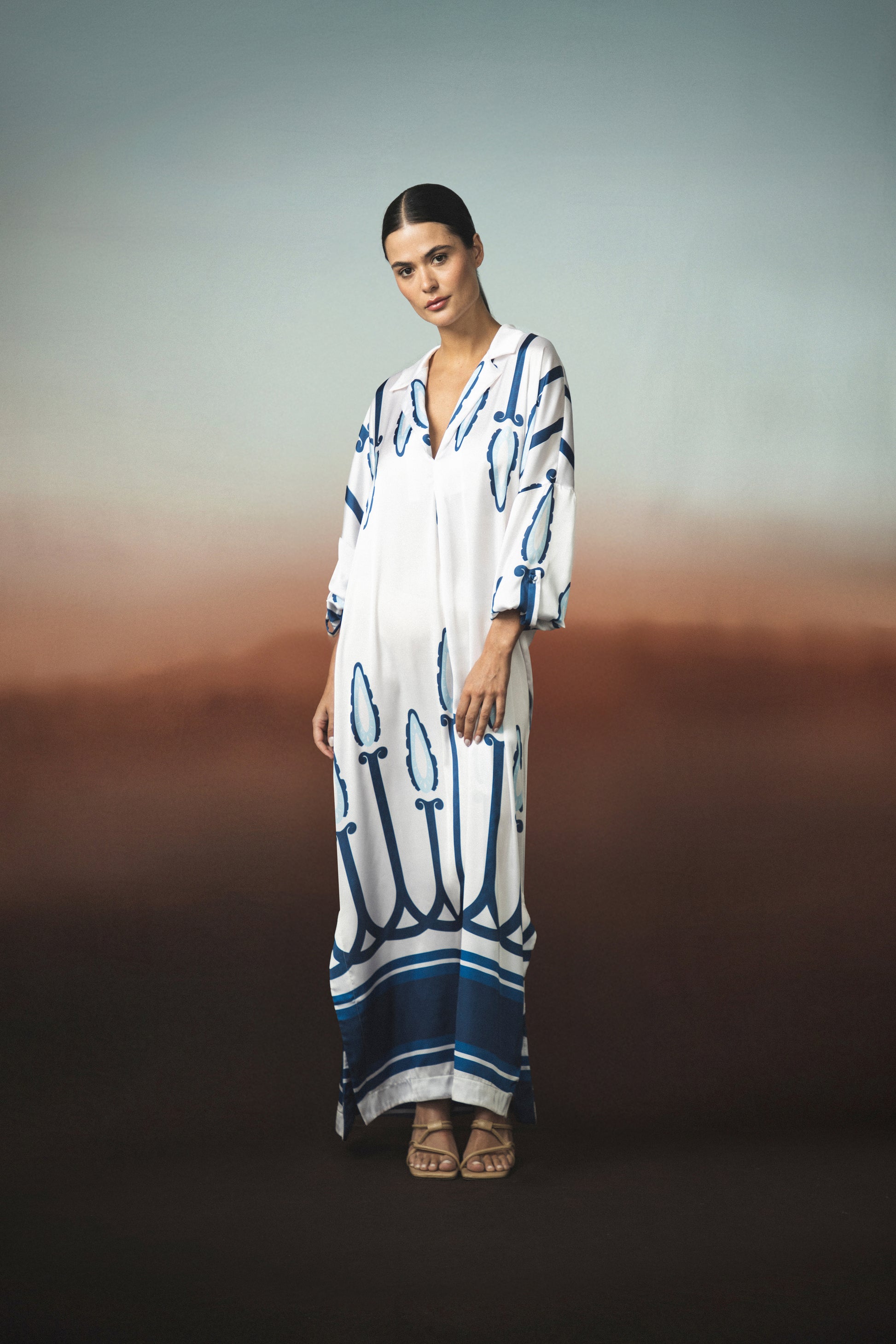 The Alma Pura tunic, a loose and ethereal silhouette that highlights the season's Blue Torches print. Inspired by the serene power of nature, this piece embodies authentic elegance and a free spirit.