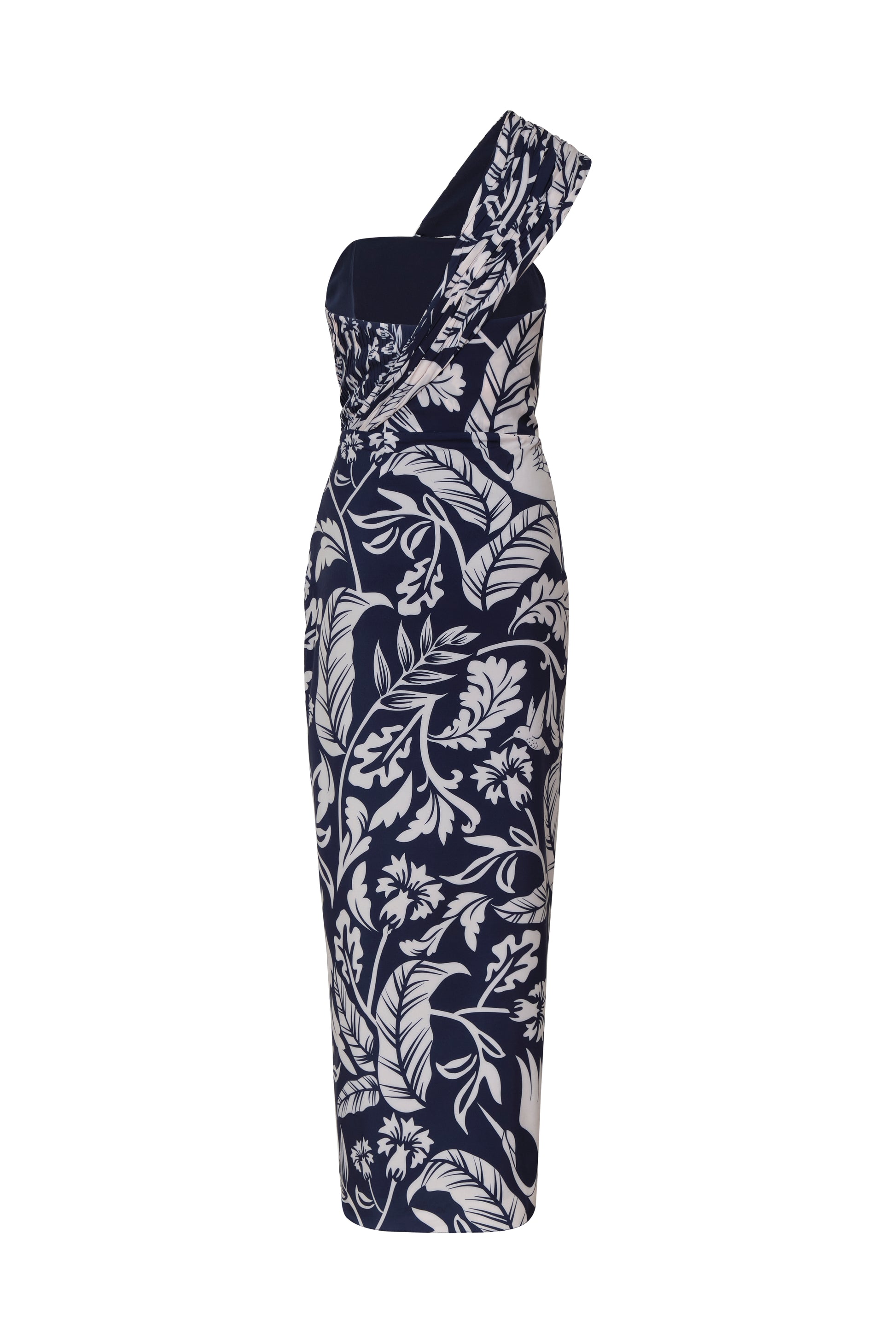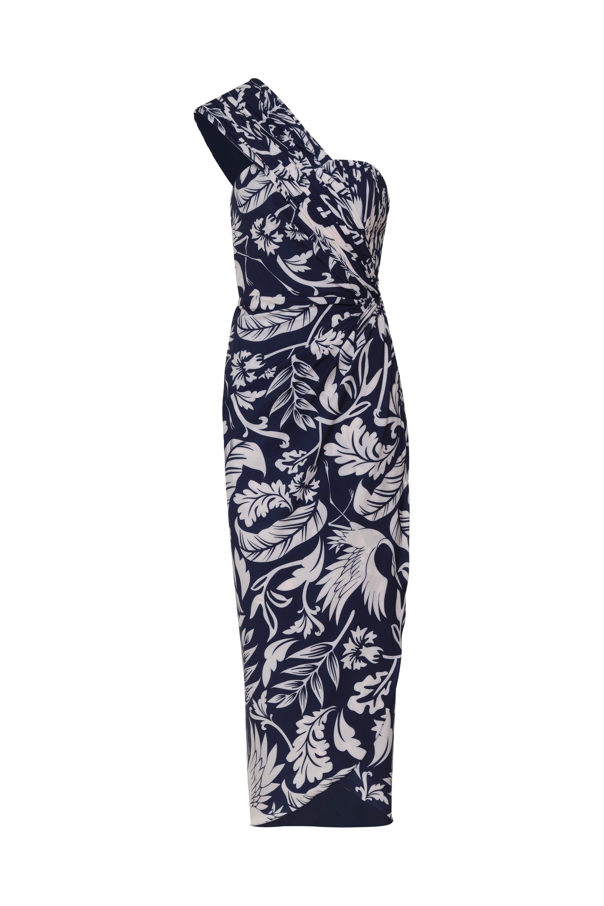 Casablanca is a pleated midi dress in Navy Maxi Birds Print, crafted in crepe with 95% recycled polyester. Featuring an elegant one-shoulder design and delicate pleated details, it's an effortlessly refined piece, perfect for daytime events.