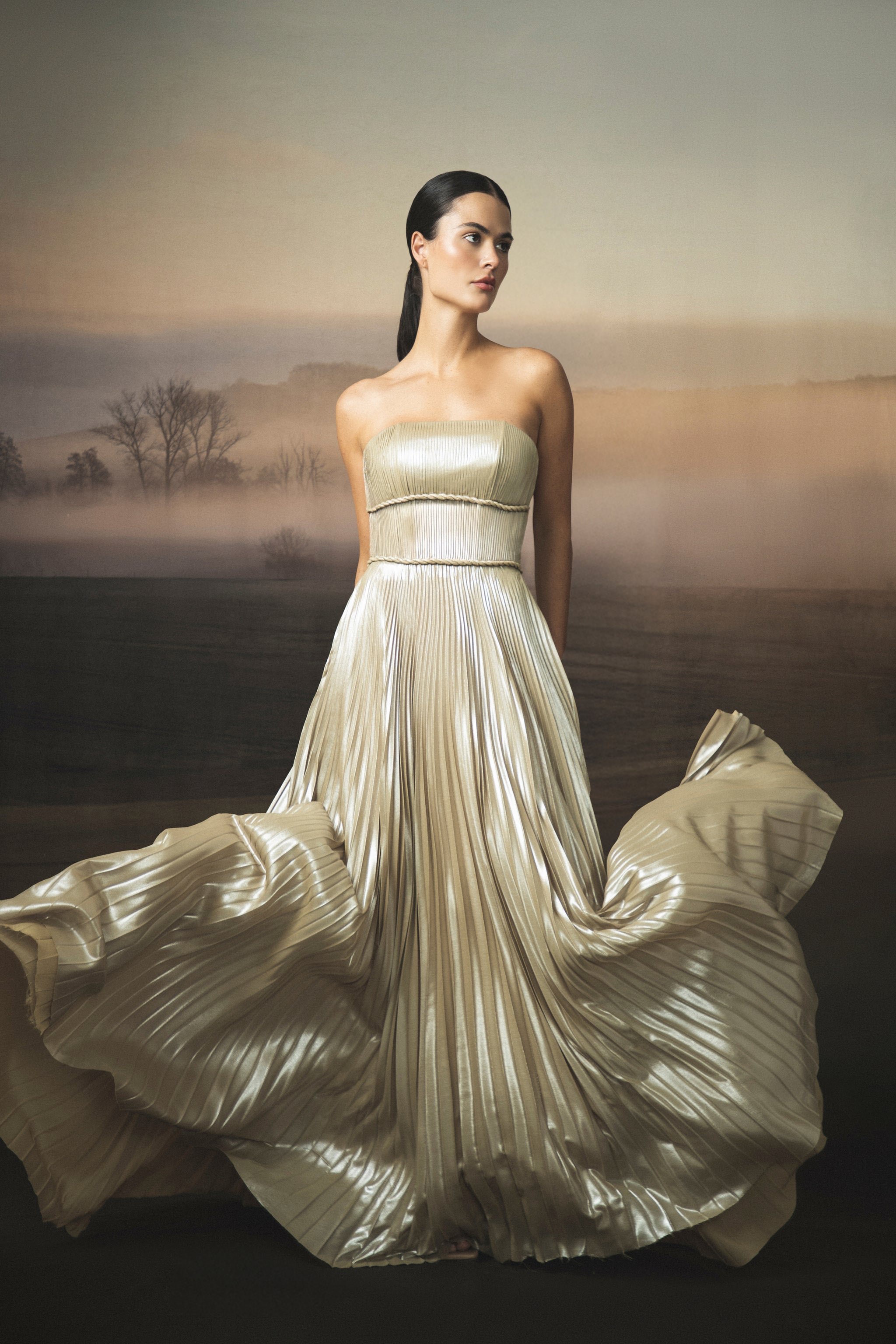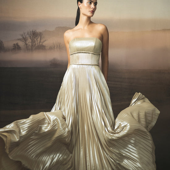 Eterna is a Maxi dress crafted from golden chiffon. Inspired by the warmth of the sun, it radiates a luminous and timeless elegance.