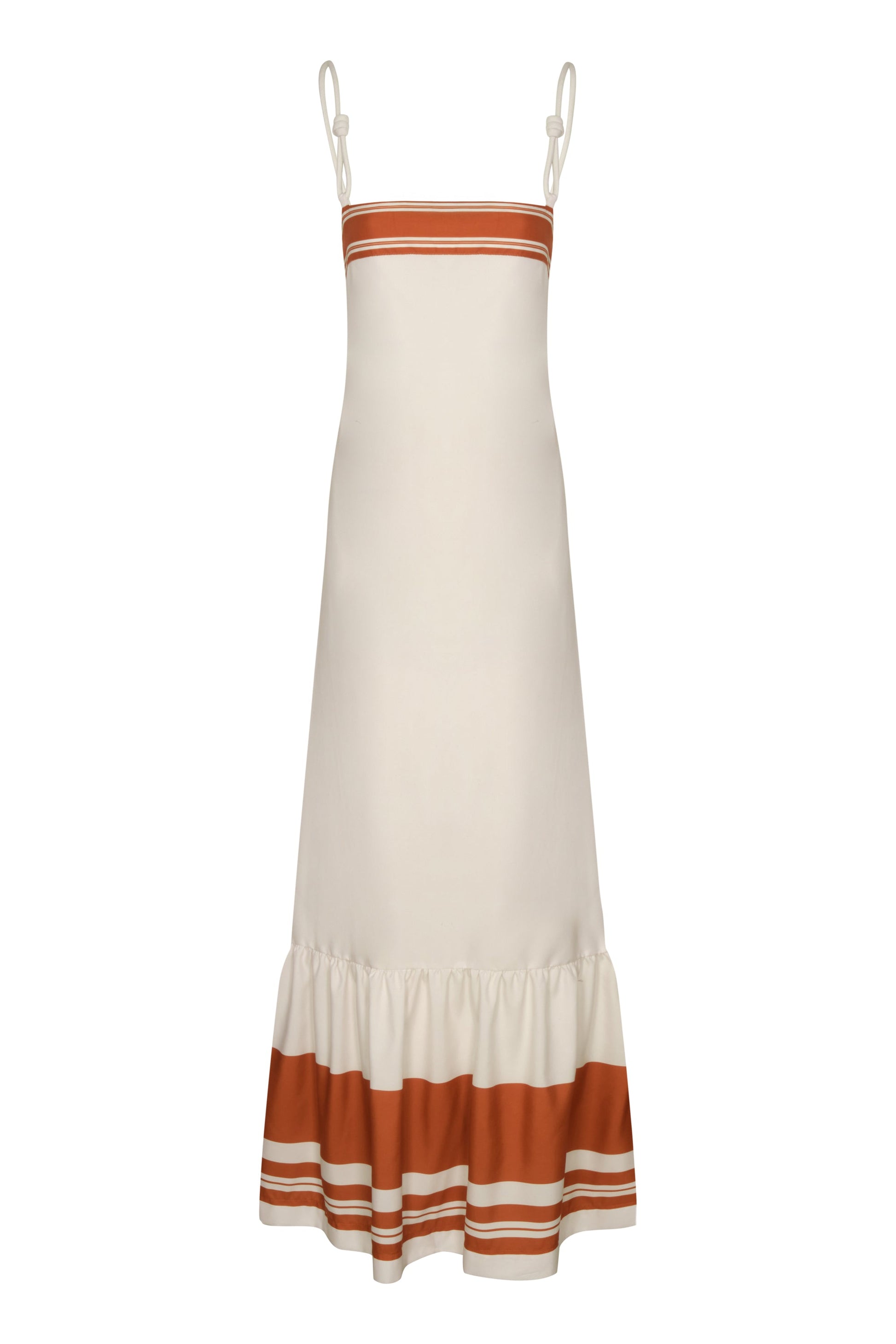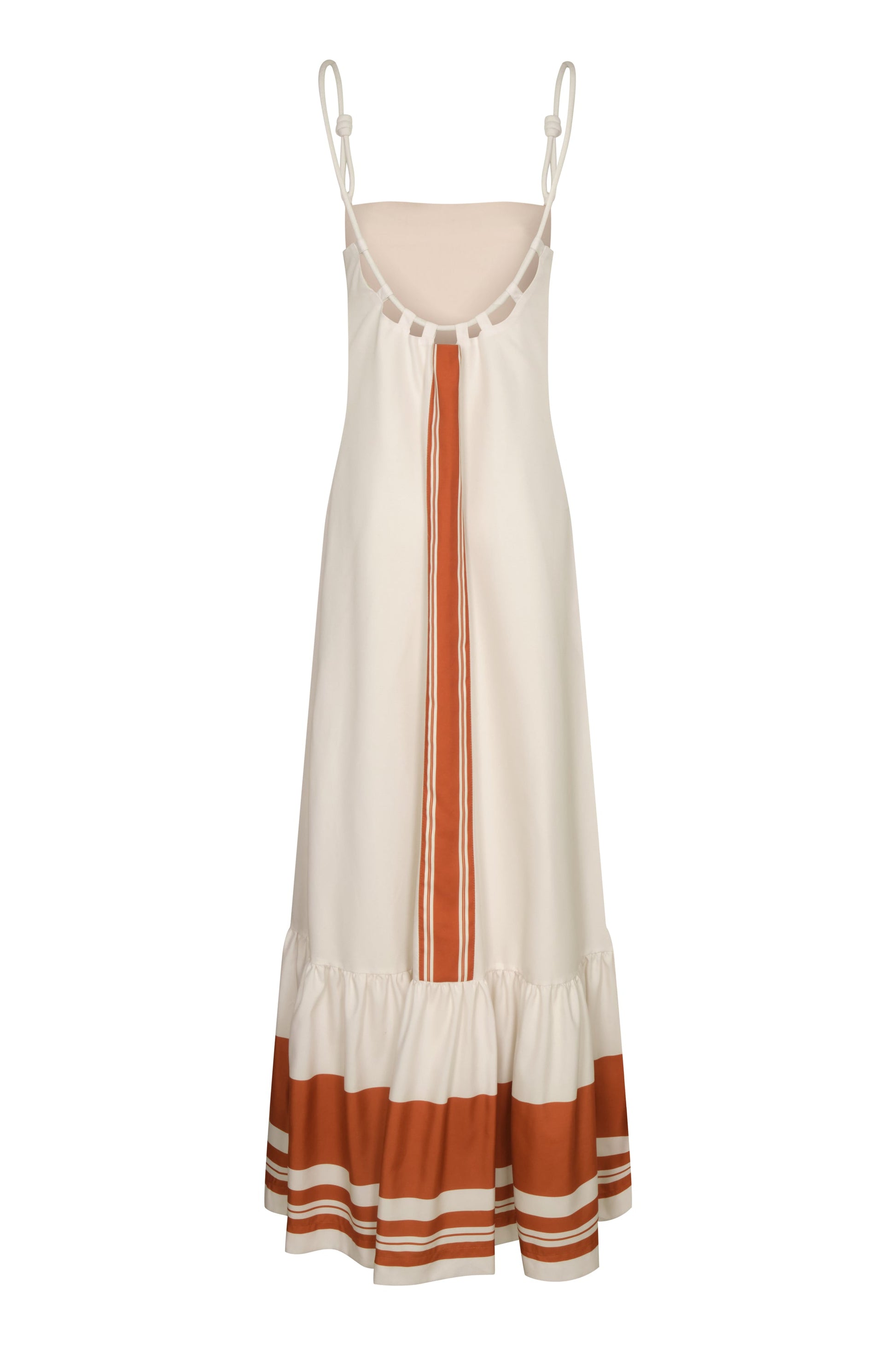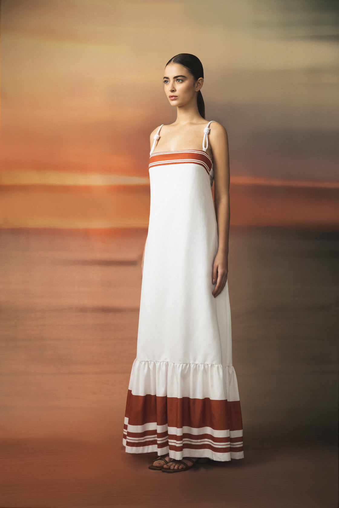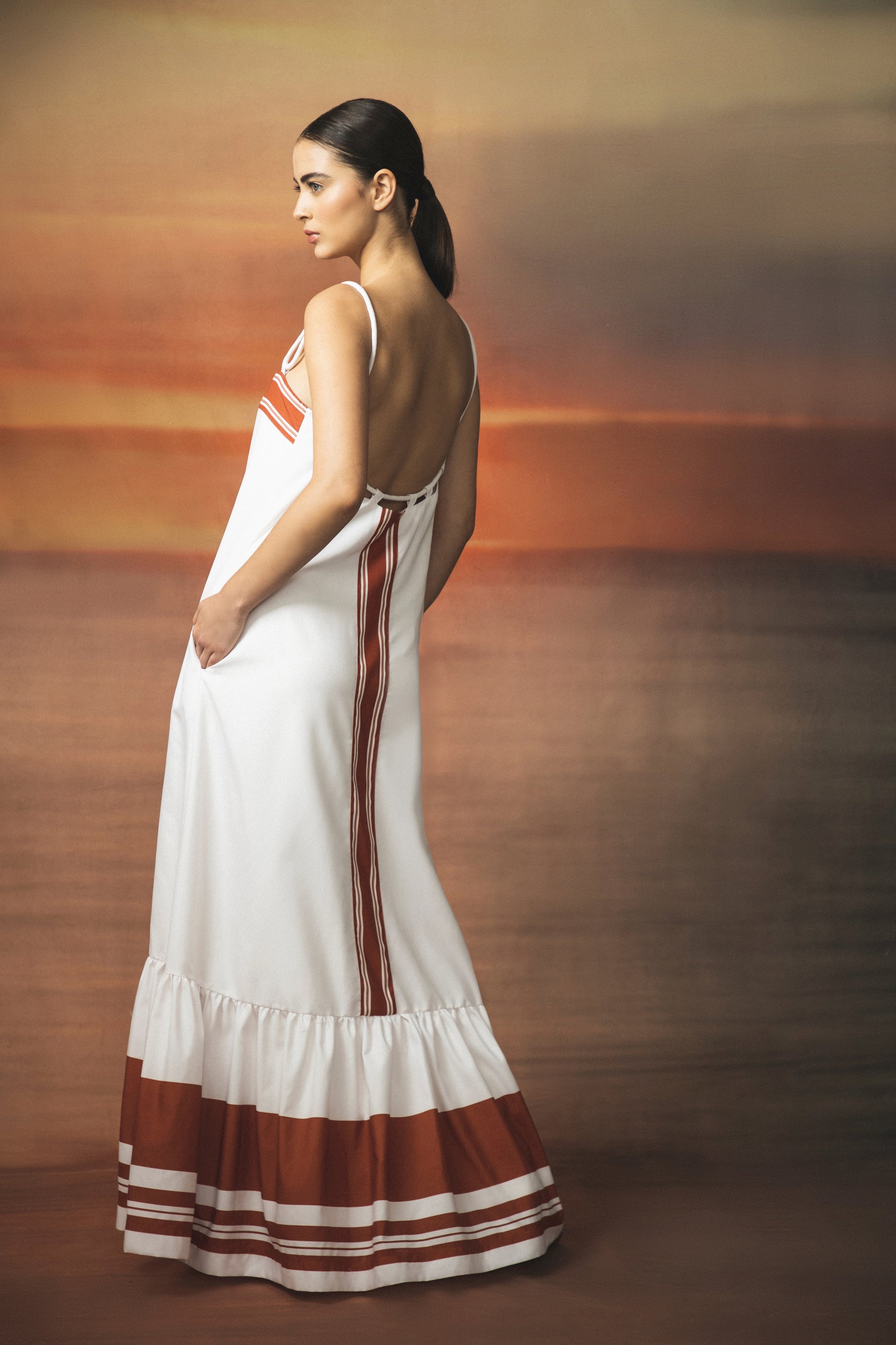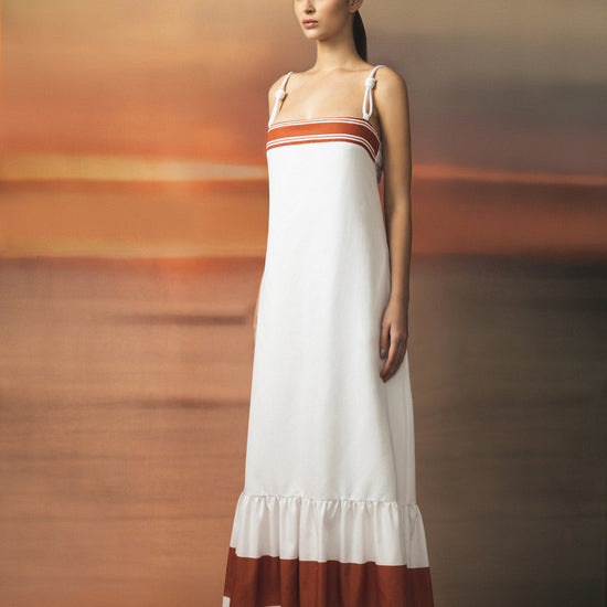 The Mis Raíces dress, a long, light silhouette with subtle terracotta lines that evoke connection and grounding. Inspired by the calm of the essential, this design stands out for its freshness and natural sophistication.