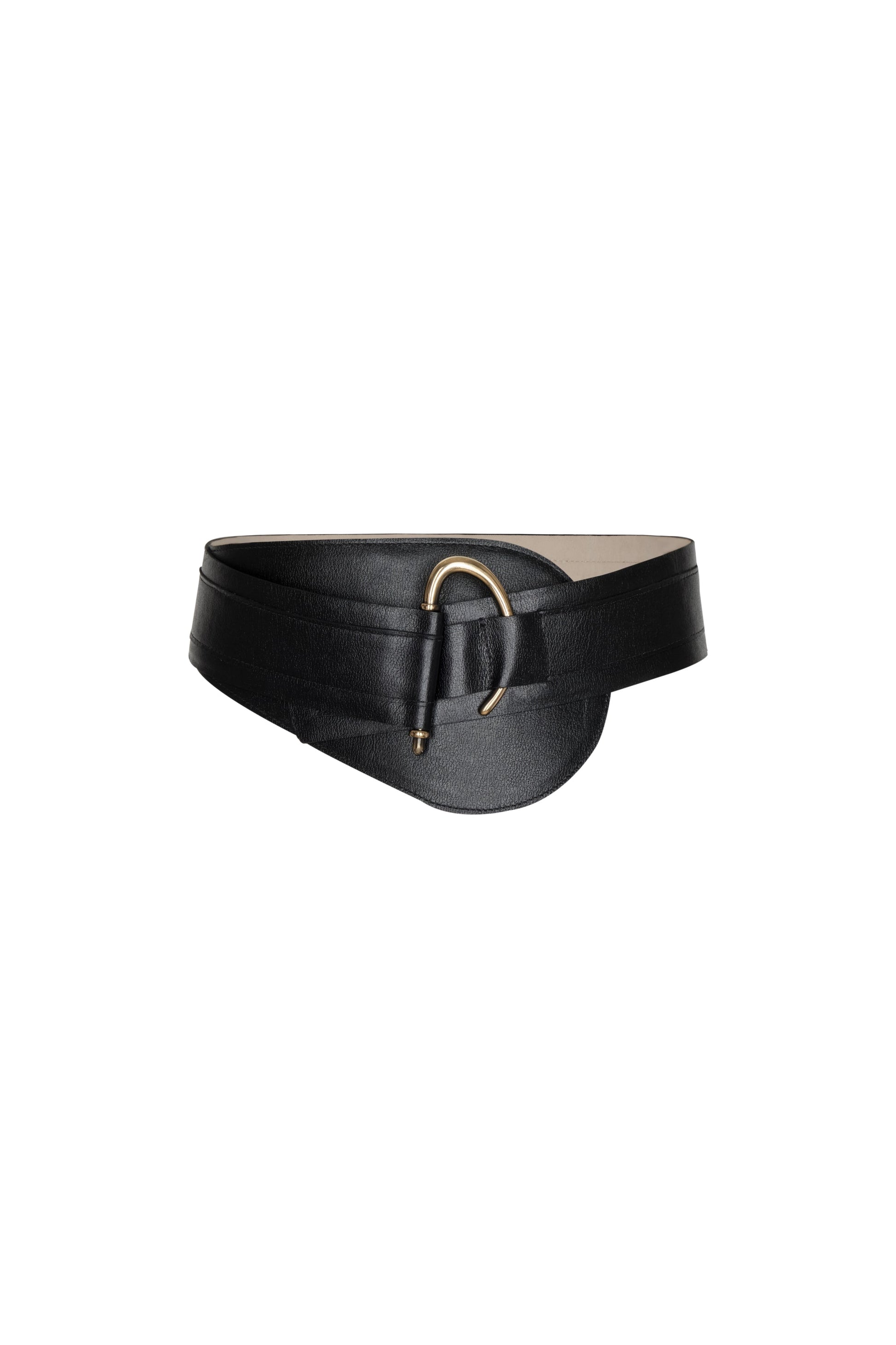 Black belt made from 100% leather. Features a wide silhouette and curved metallic buckle. A bold and refined accessory.