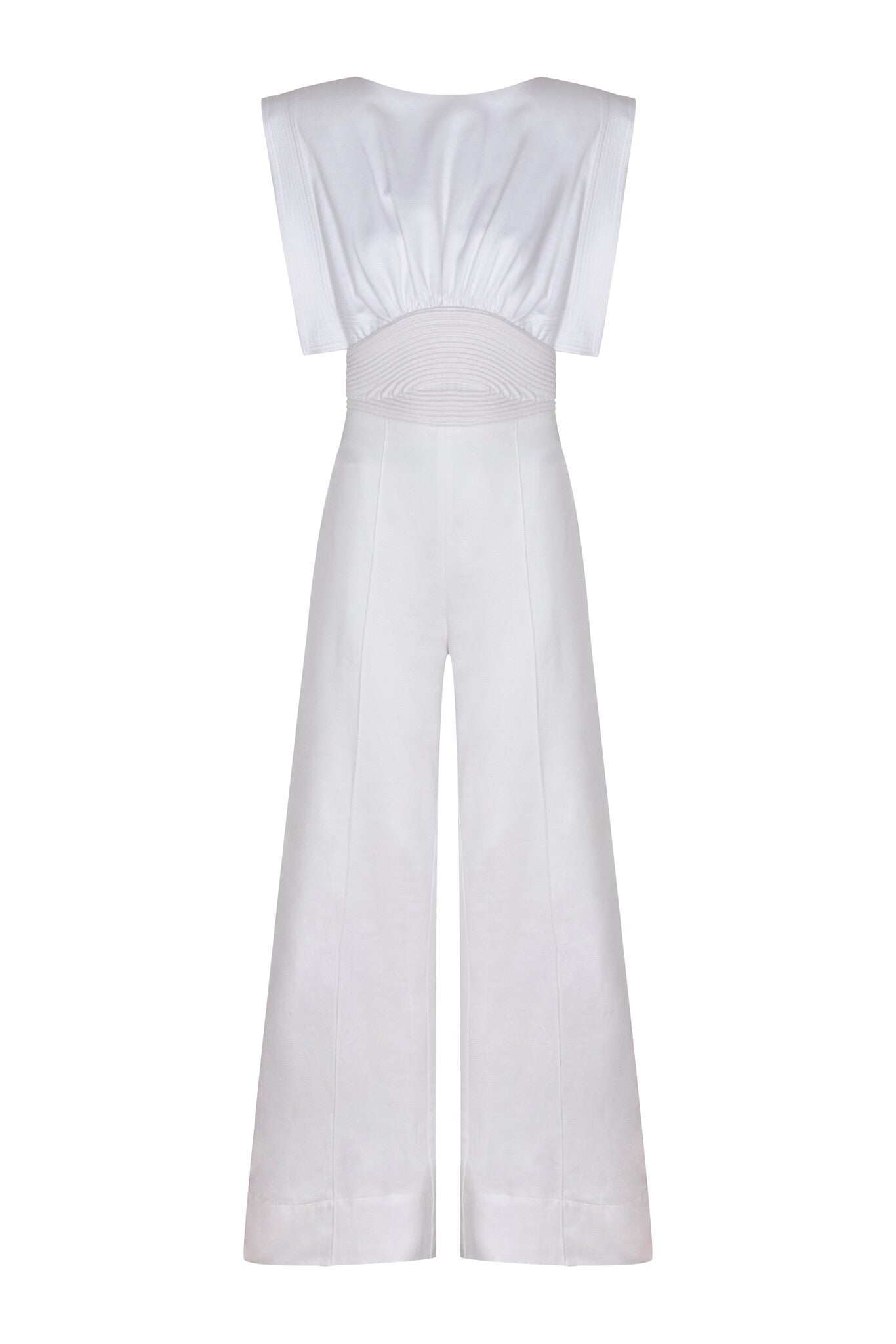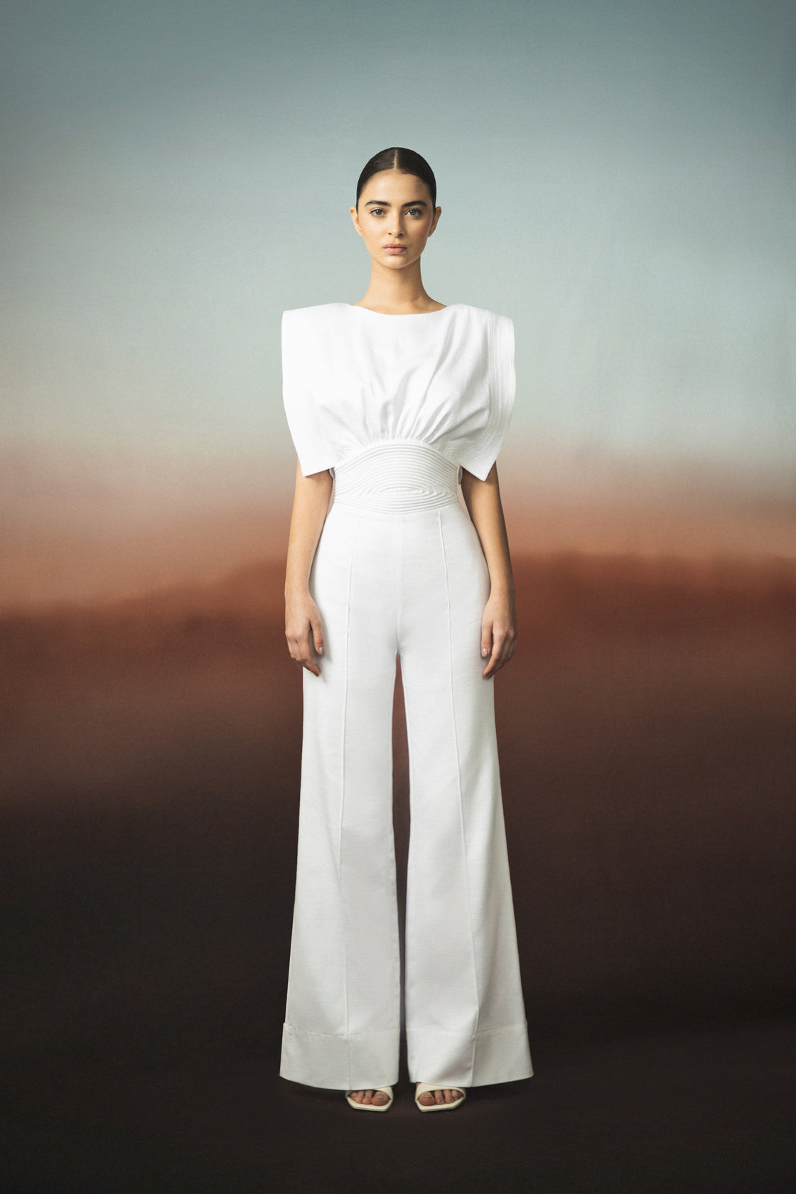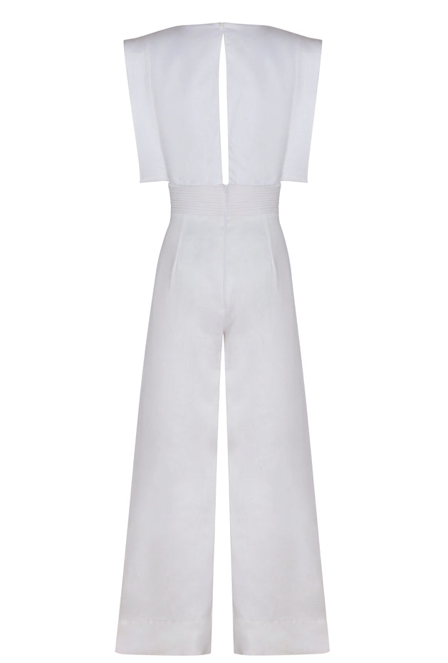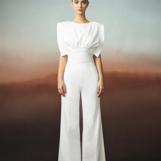 "Lienzo Abierto" is a Off-White jumpsuit made from twill cotton. Its relaxed, striking silhouette highlights the vibrant color.