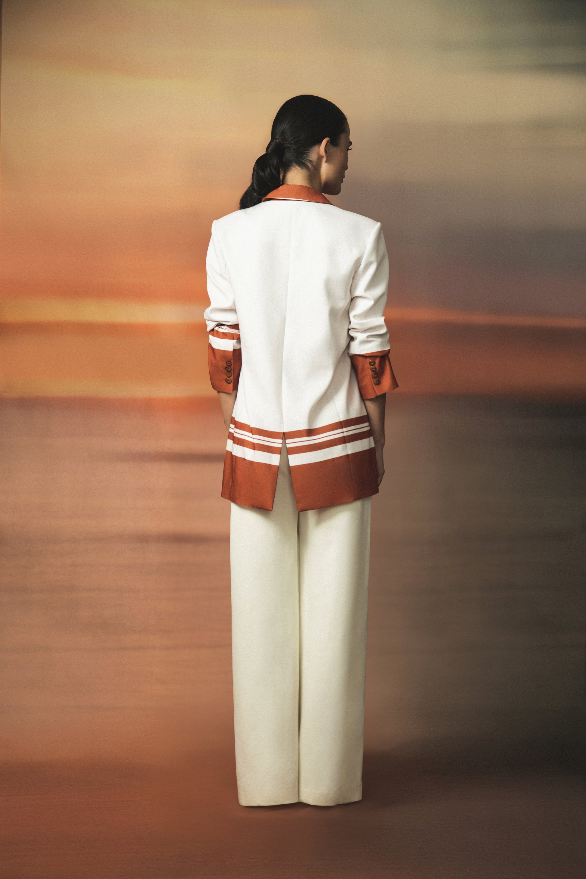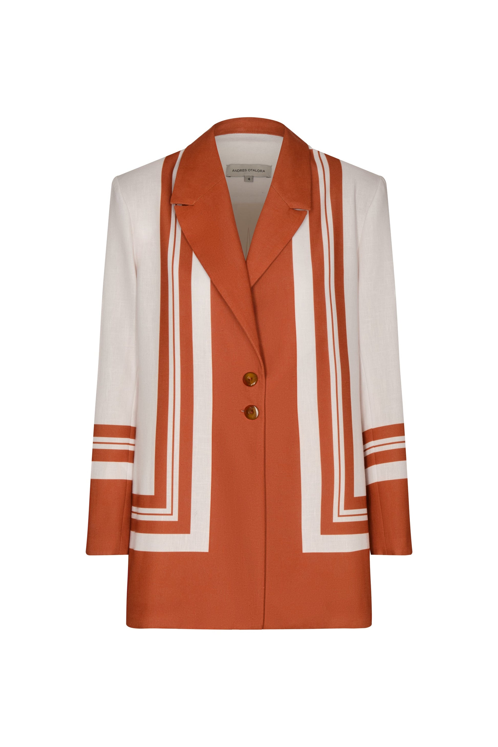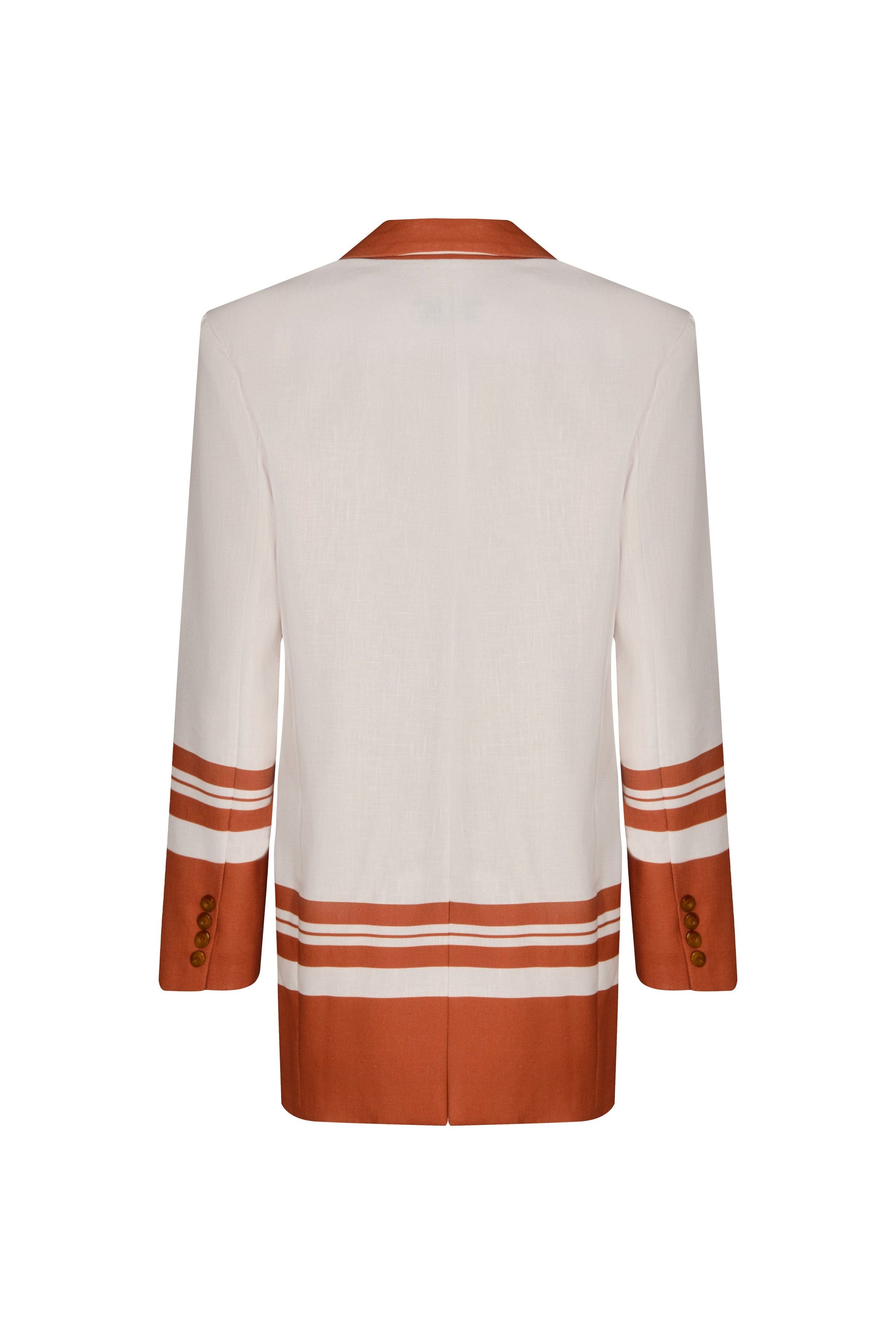 White blazer with orange stripes, made from 100% linen. It features a straight cut, classic lapels, and button closure. A structured garment with presence.