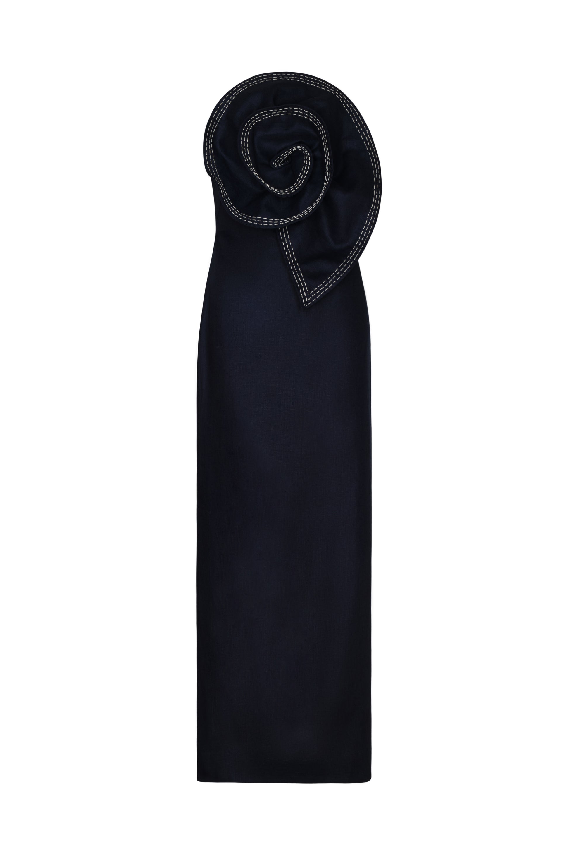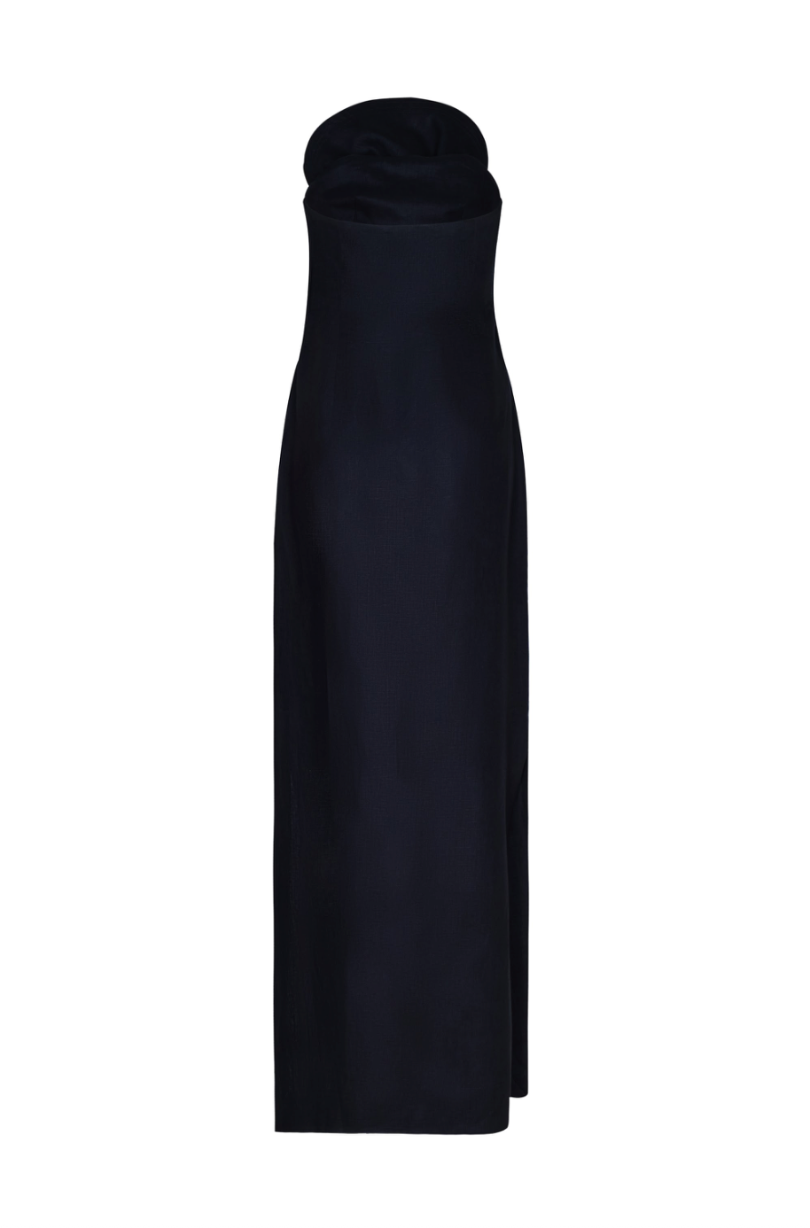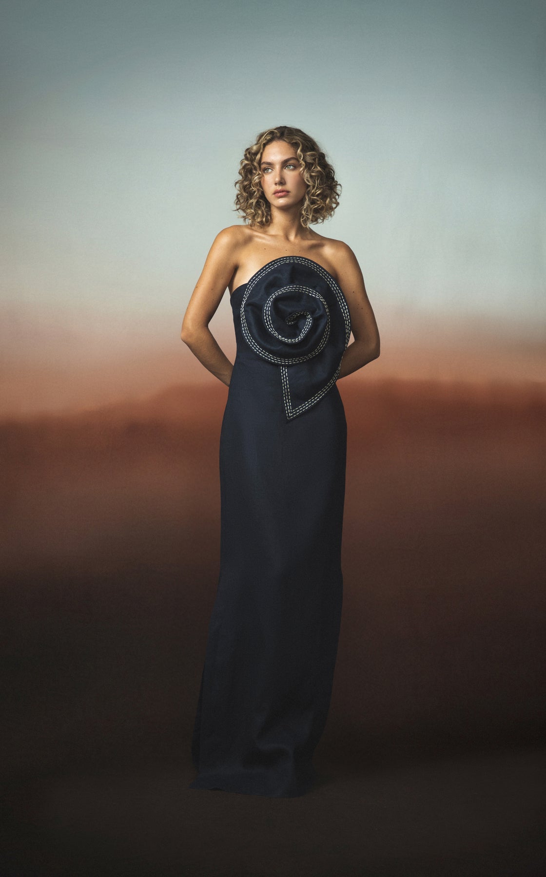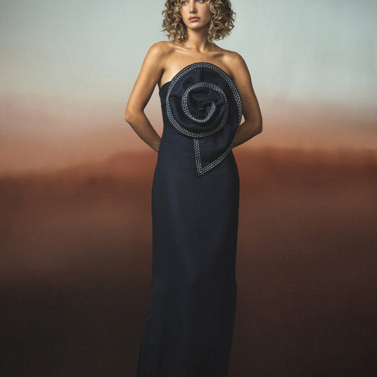 The Tactos dress fuses structure and artistry in a minimalist silhouette with sculptural detail. Inspired by the organic forms of nature and crafted from linen, it embodies elegance with character.