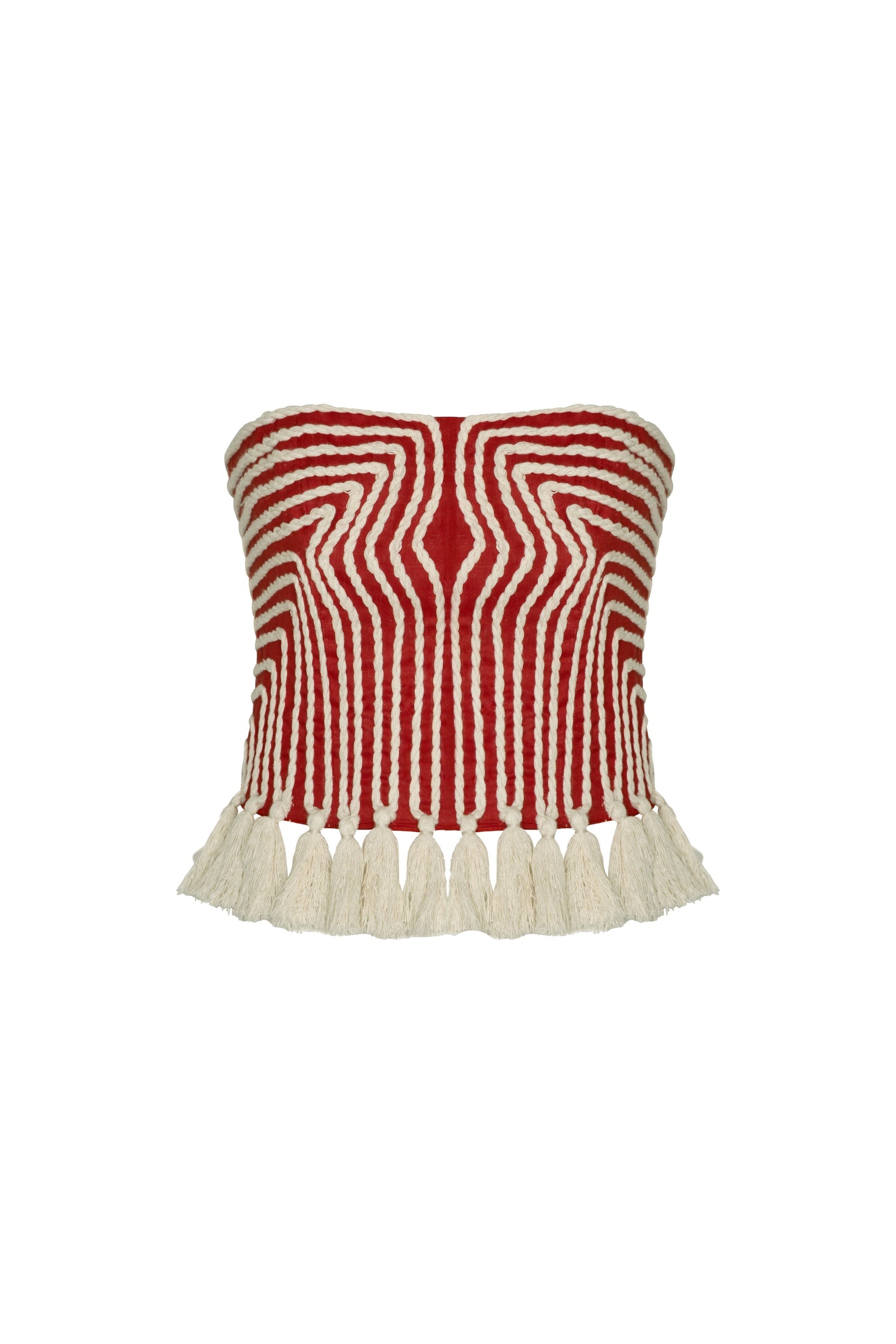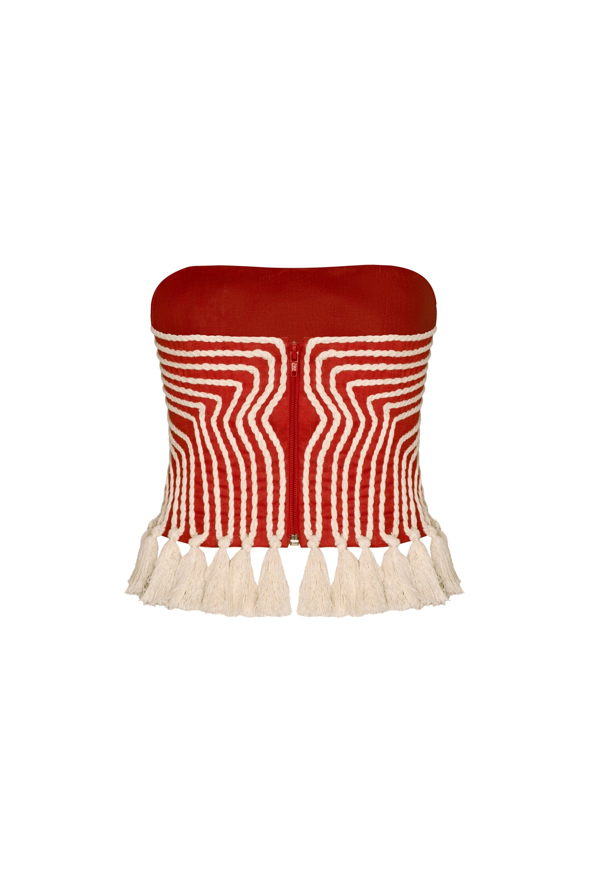 "Escuchas" is a strapless linen-embroidered top that celebrates artisanal craftsmanship with a unique wine-colored design. Its structured silhouette and delicate hemline evoke strength and femininity with a contemporary feel.