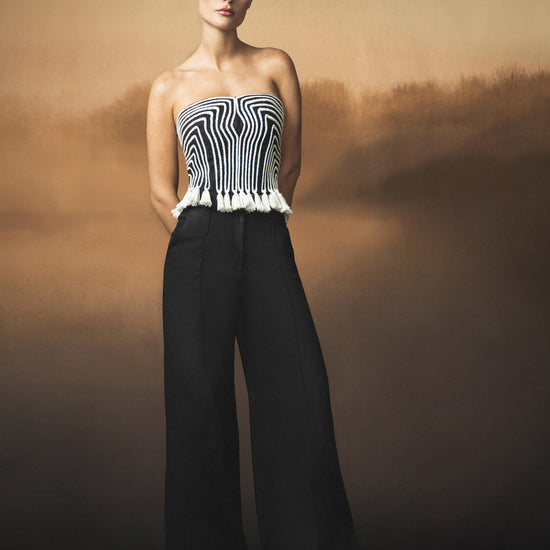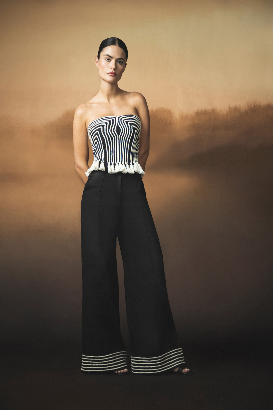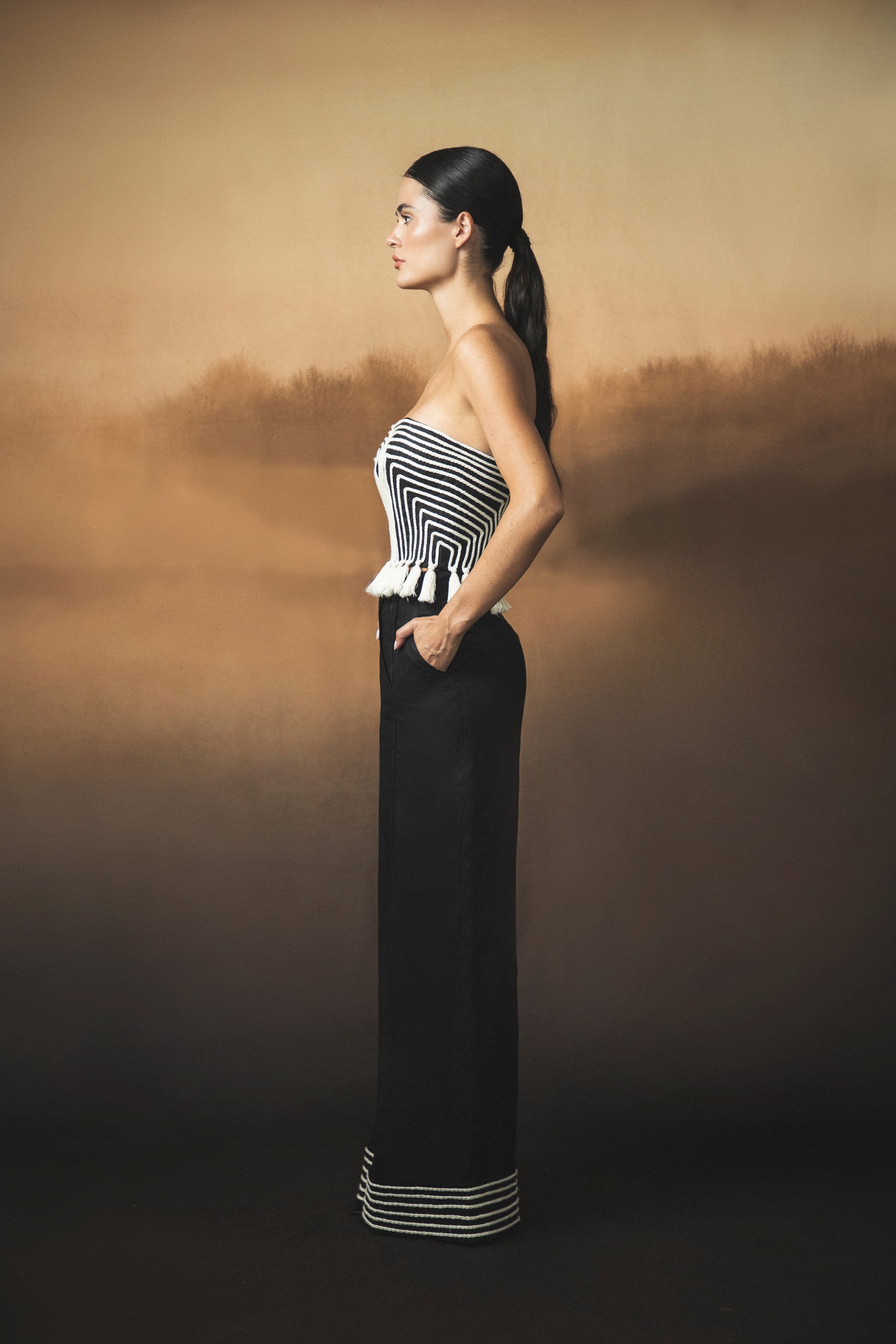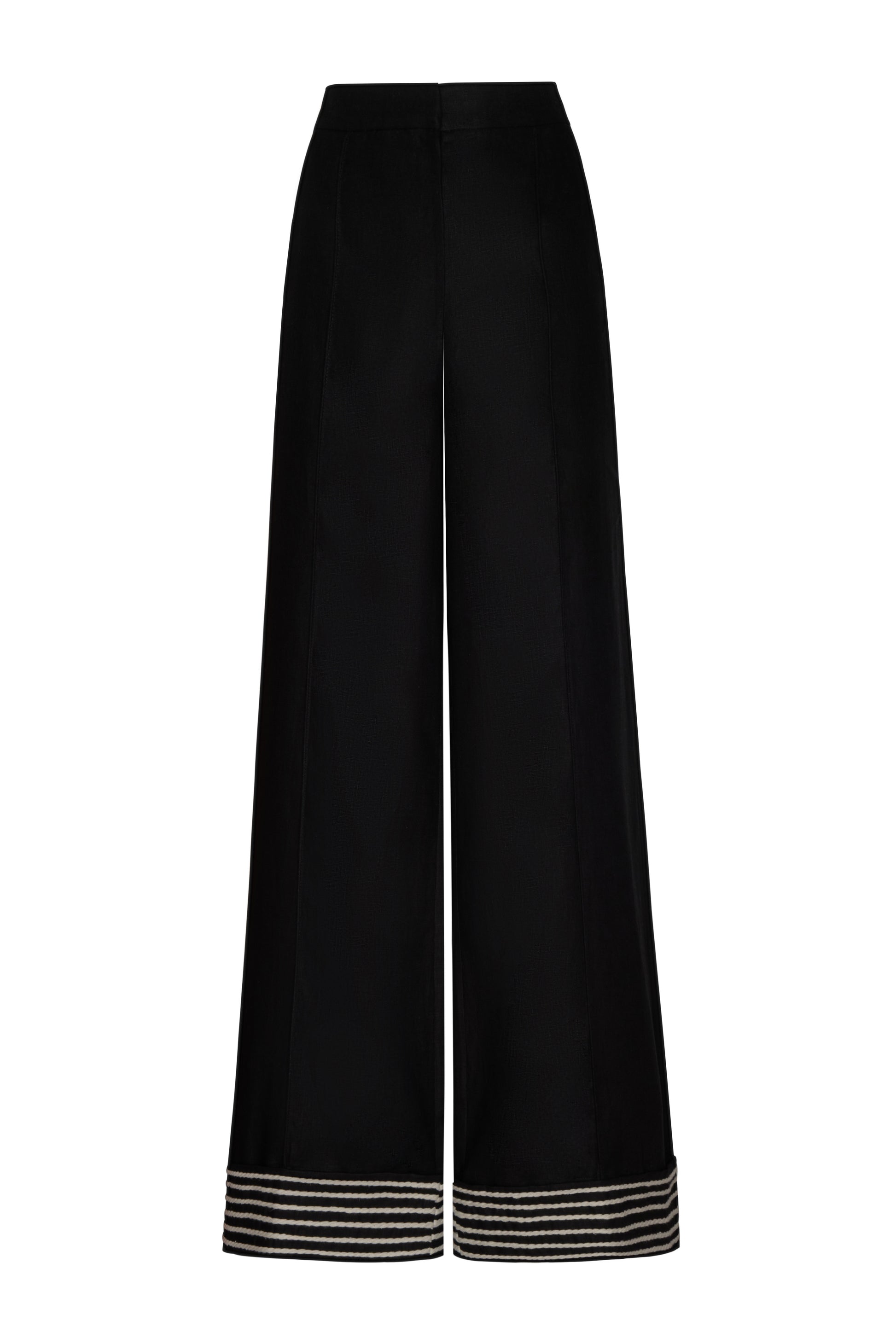 Trousers crafted from 100% linen with delicate embroidered lines at the hem. Their clean design and subtle contrast elevate any look with understated elegance.