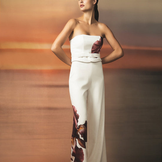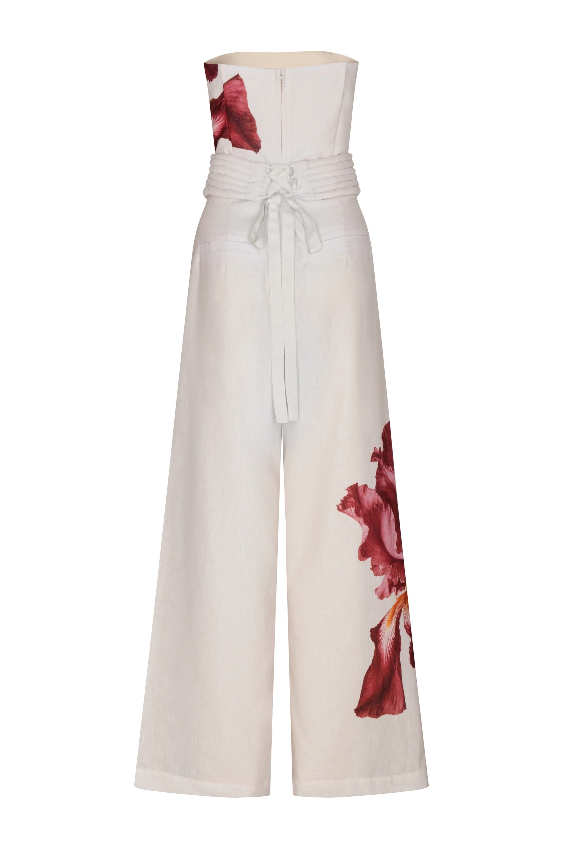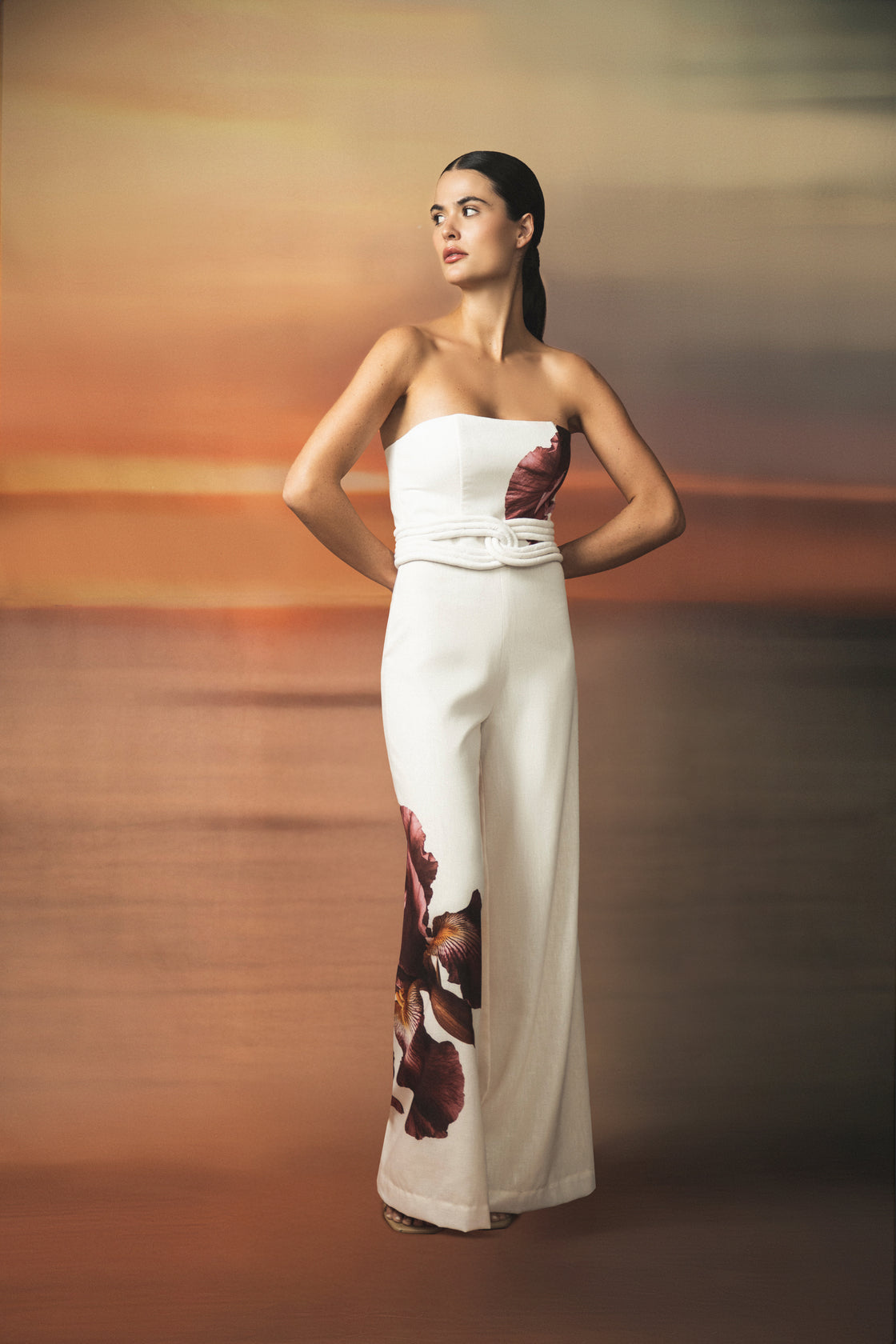 Cattleya is a strapless, belted jumpsuit made of linen. Inspired by the flower that bears its name, it stands out for its soft color and fresh, feminine silhouette.