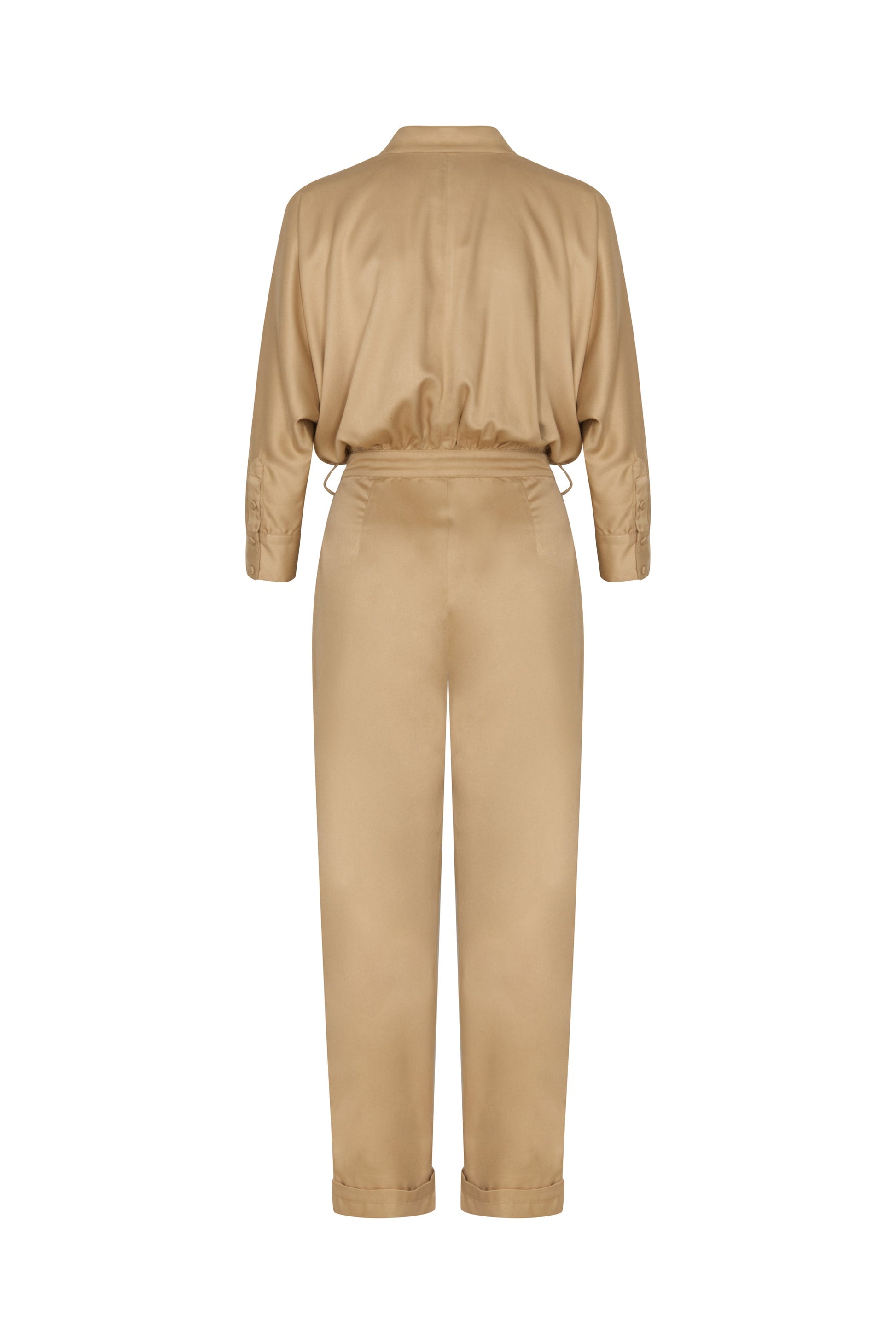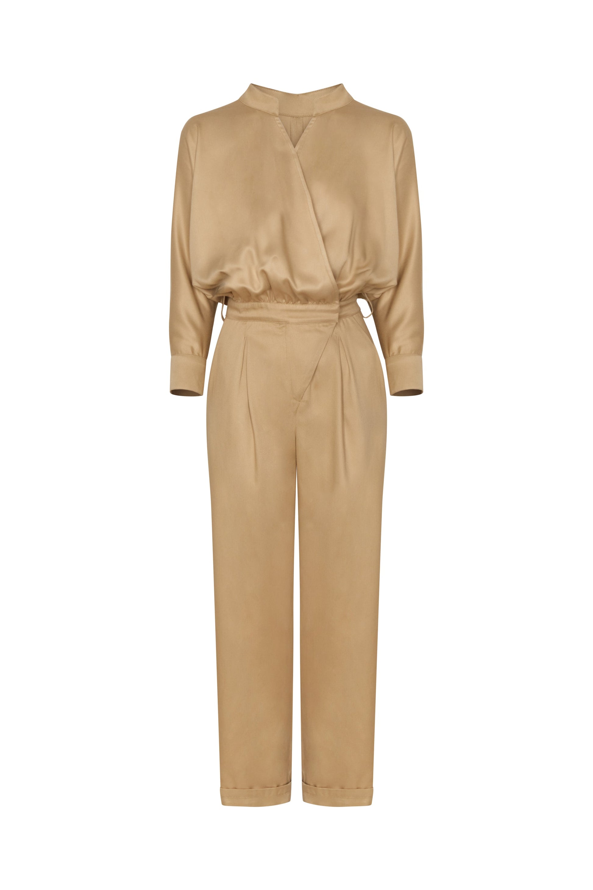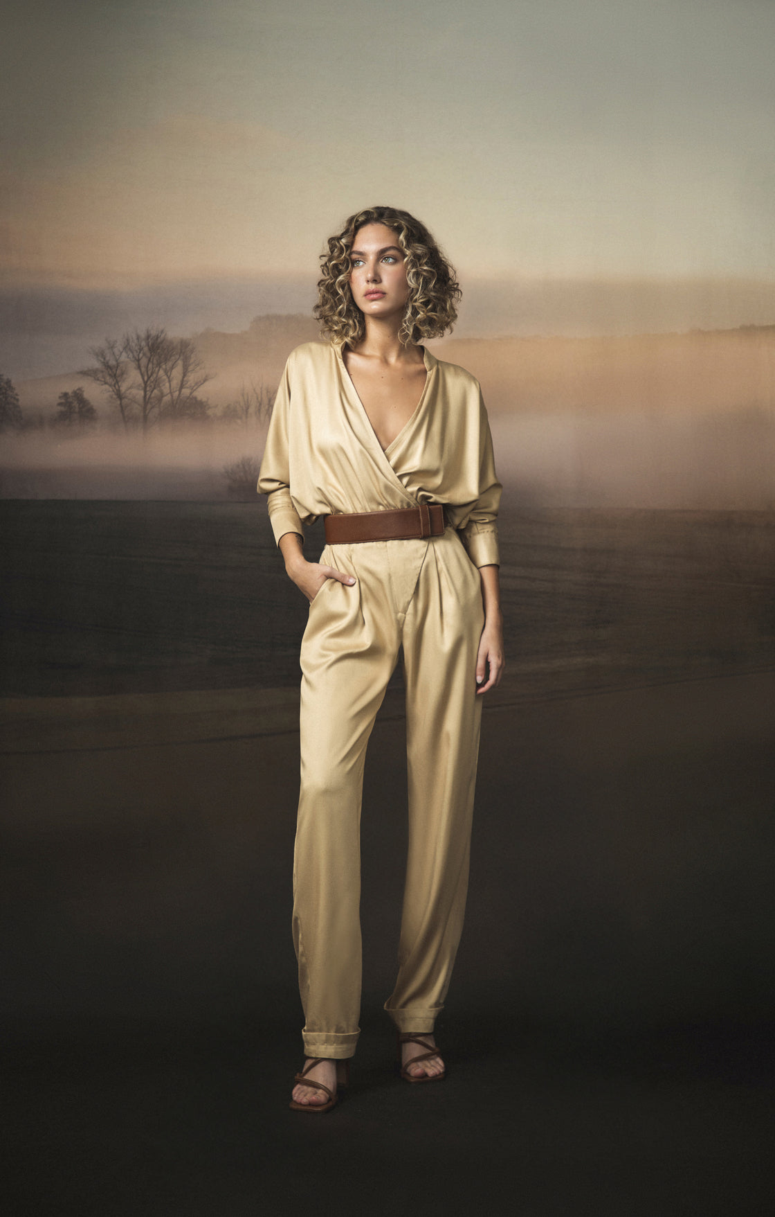 "Brillo Interno" is a golden rayon jumpsuit. Its fluid silhouette and warm color reflect a natural, luminous elegance.