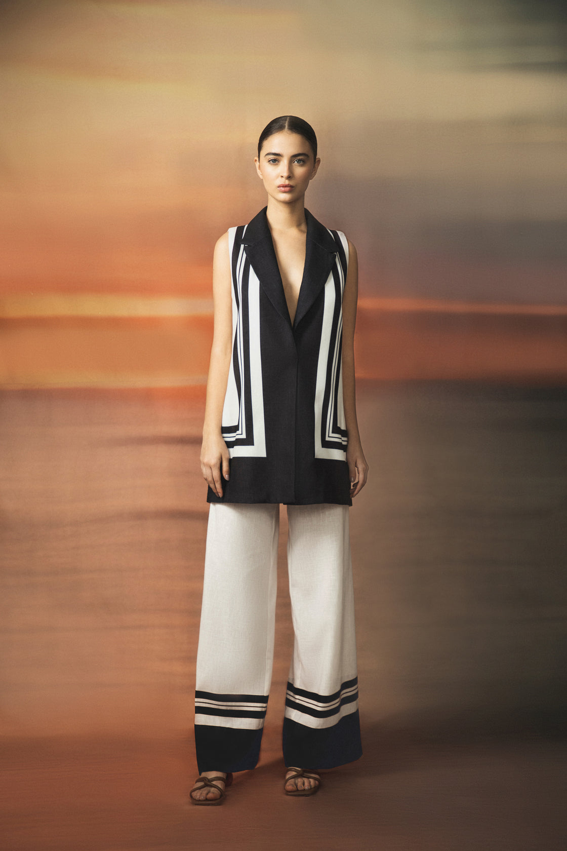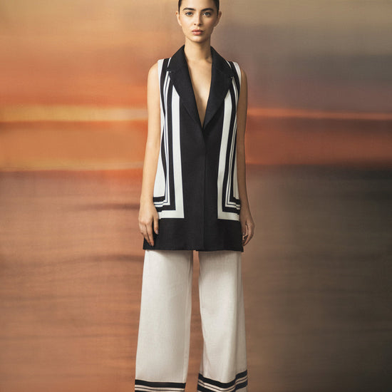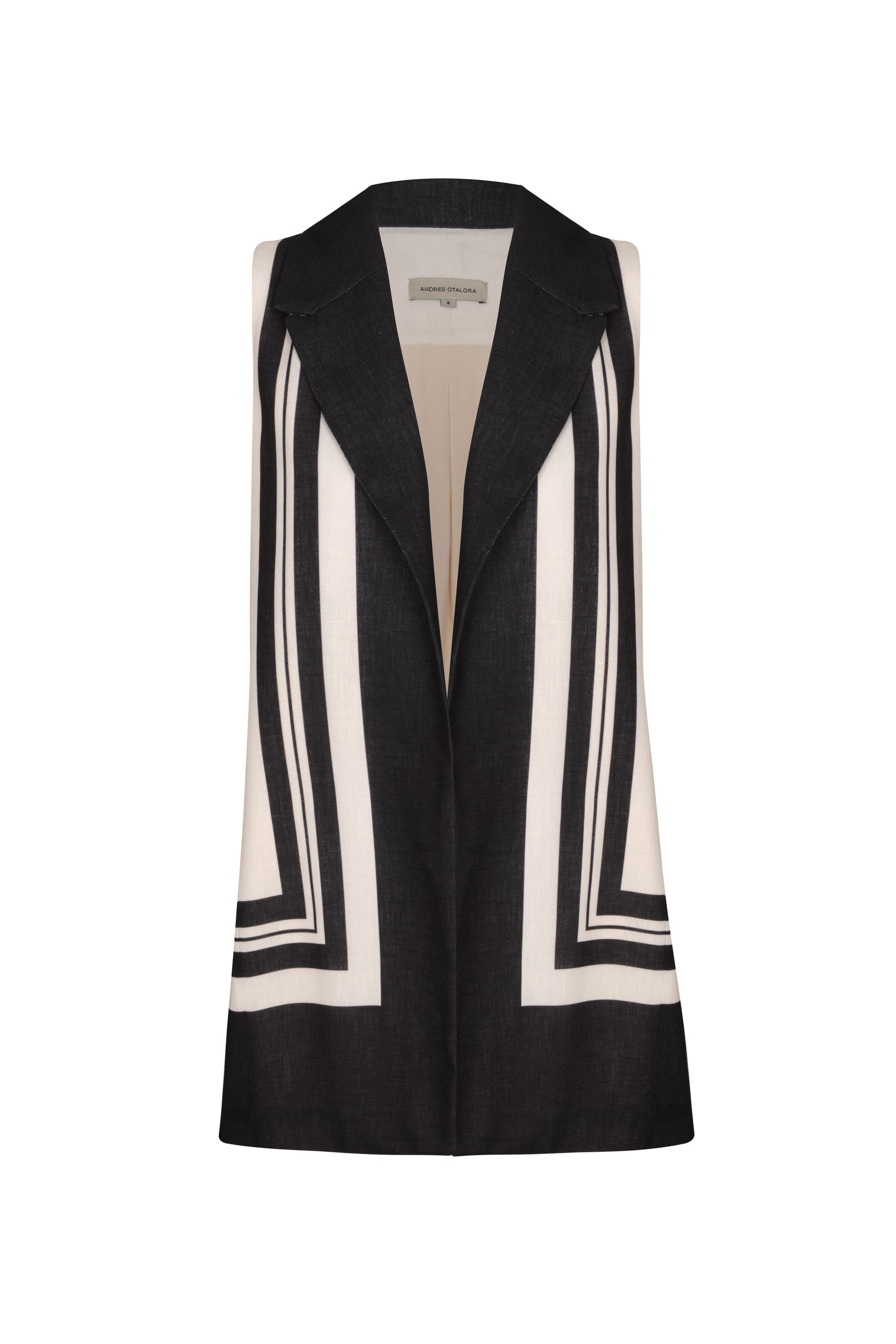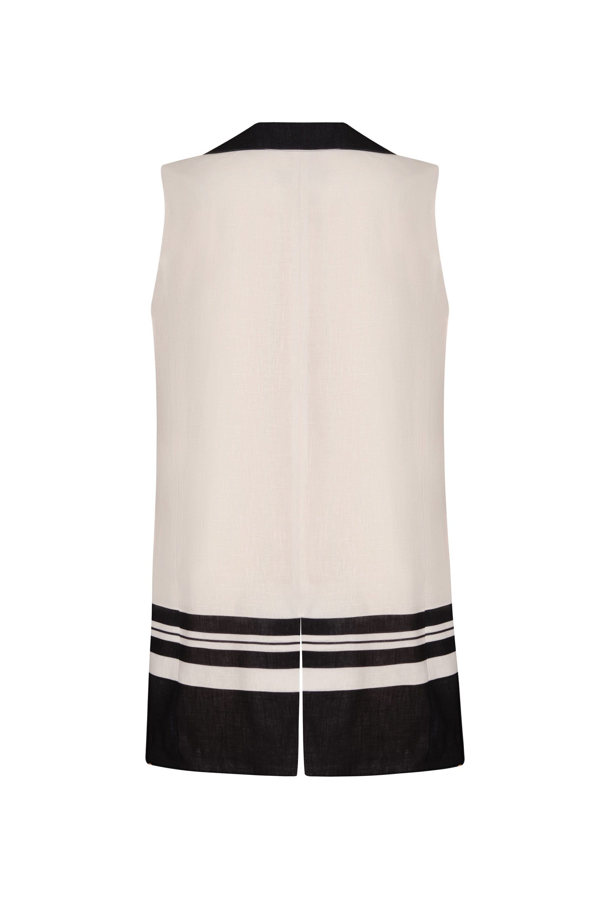 Black-striped vest made from 100% linen. It features a straight silhouette and a V-neckline. A lightweight and elegant garment.