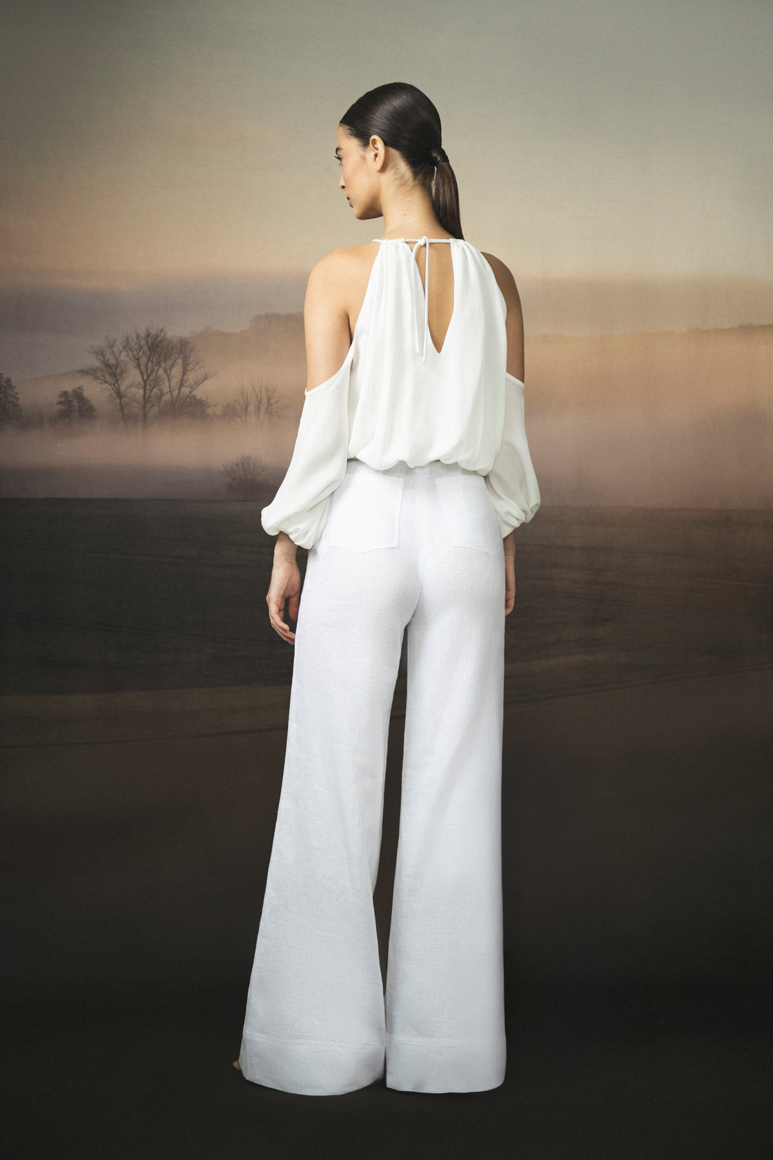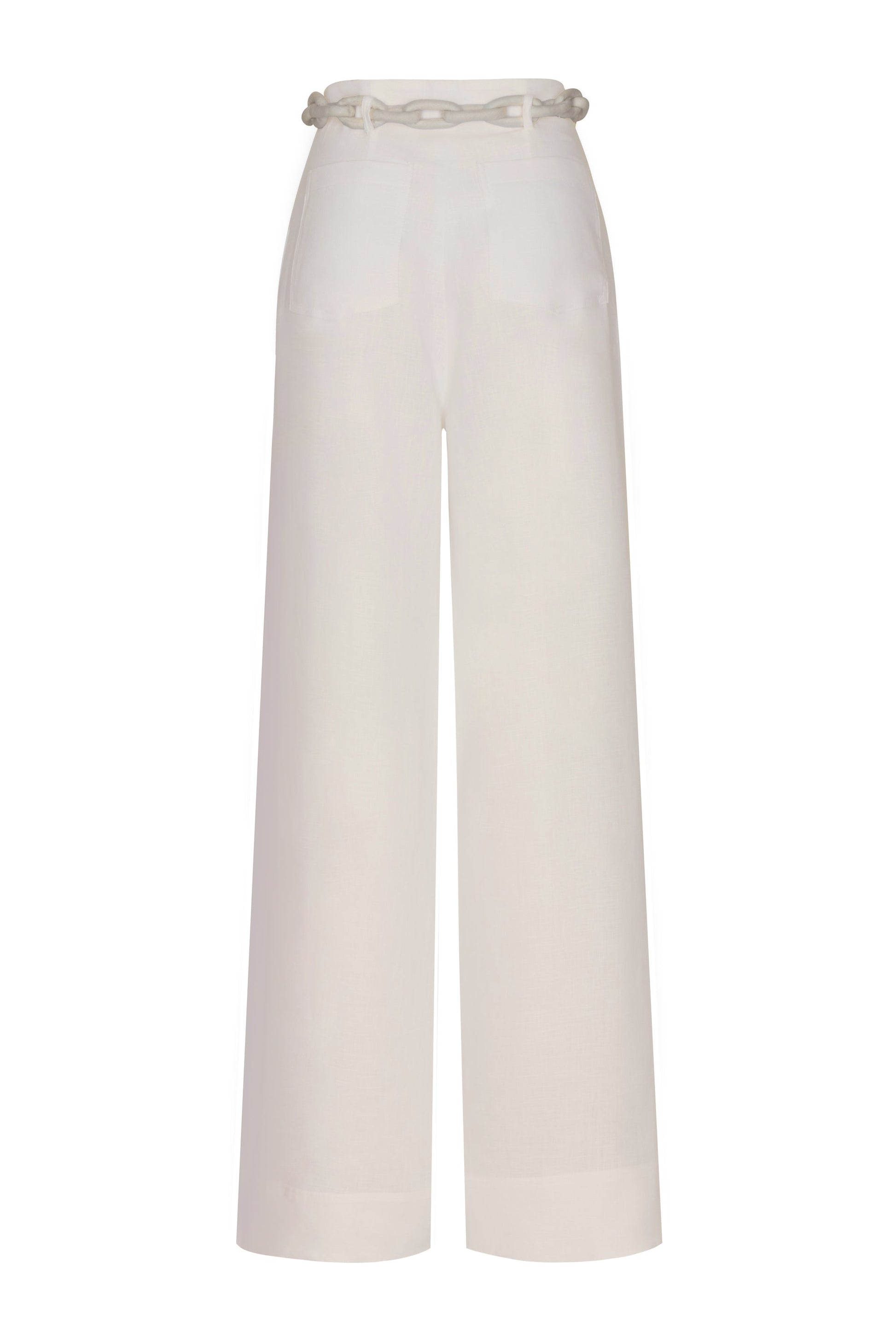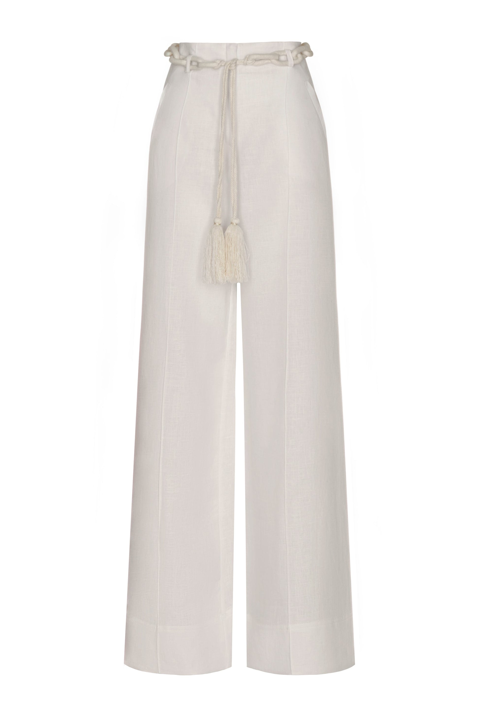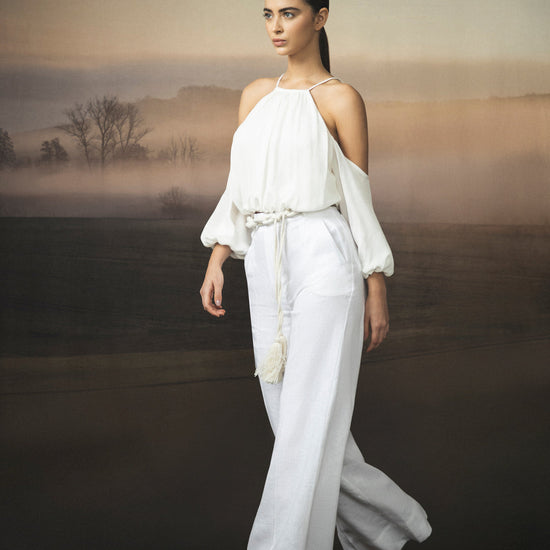 Senda Ecru is an off-white pant crafted from pure linen. Its woven belt adds a handcrafted touch to a clean, serene silhouette.