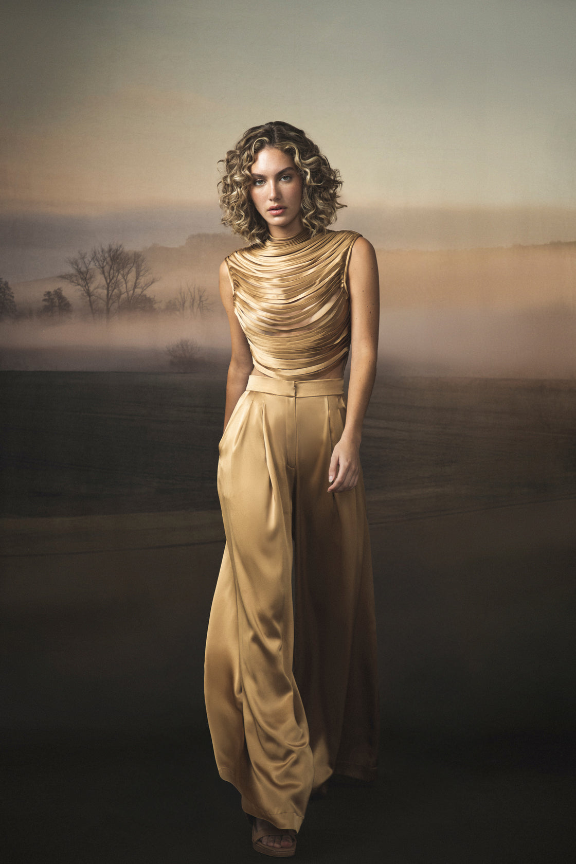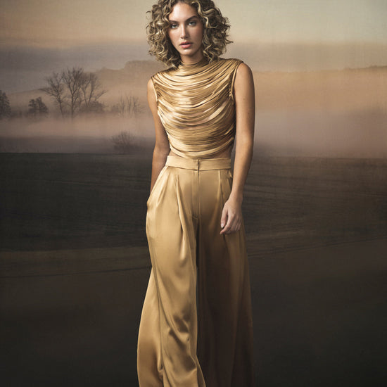 Luz Perpetua is gold pant made from natural silk that flows delicately. Its subtle sheen and elegant drape make it a sophisticated and timeless piece.