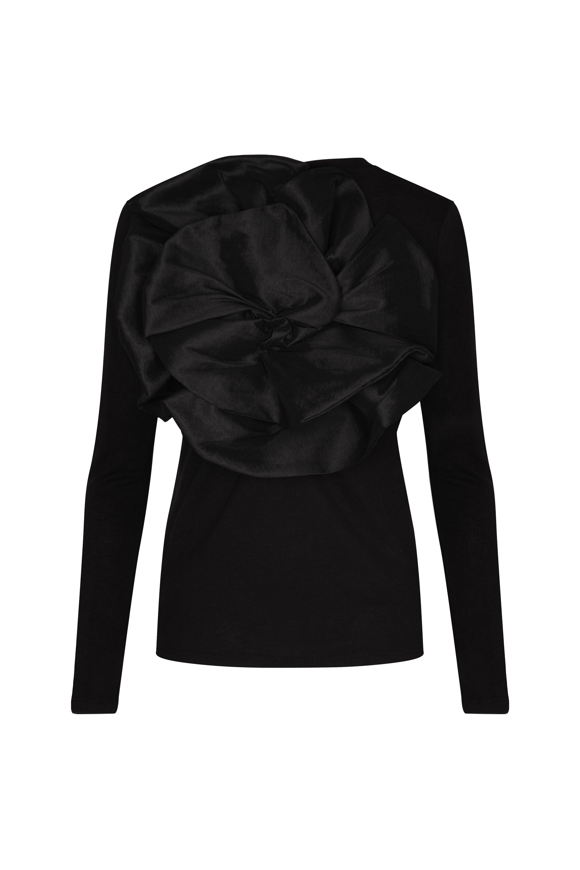 “Memoria Pura” is a black knit sweater that celebrates elegance in its purest form. Its clean design is enhanced by a floral motif that adds a subtle and distinctive touch.