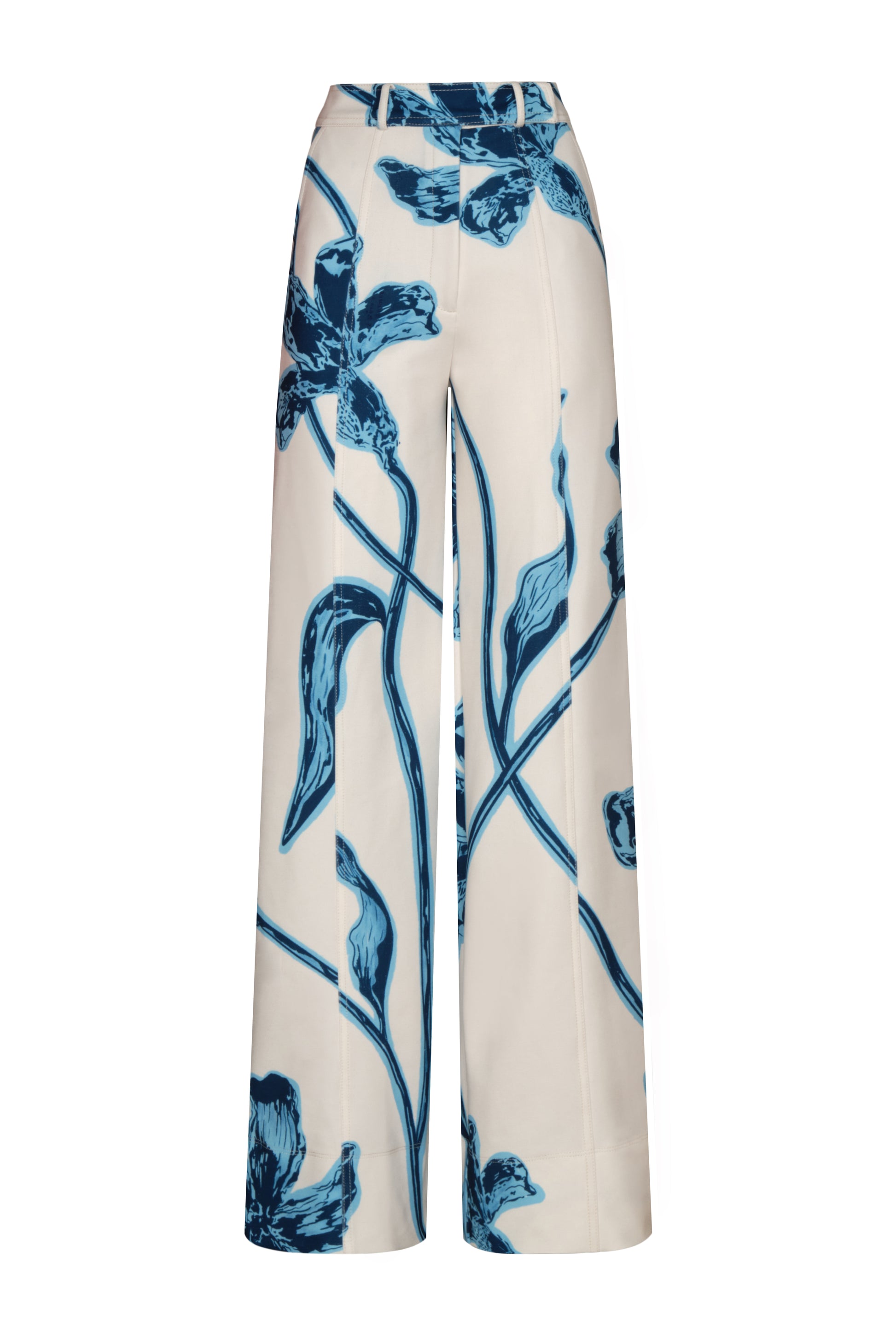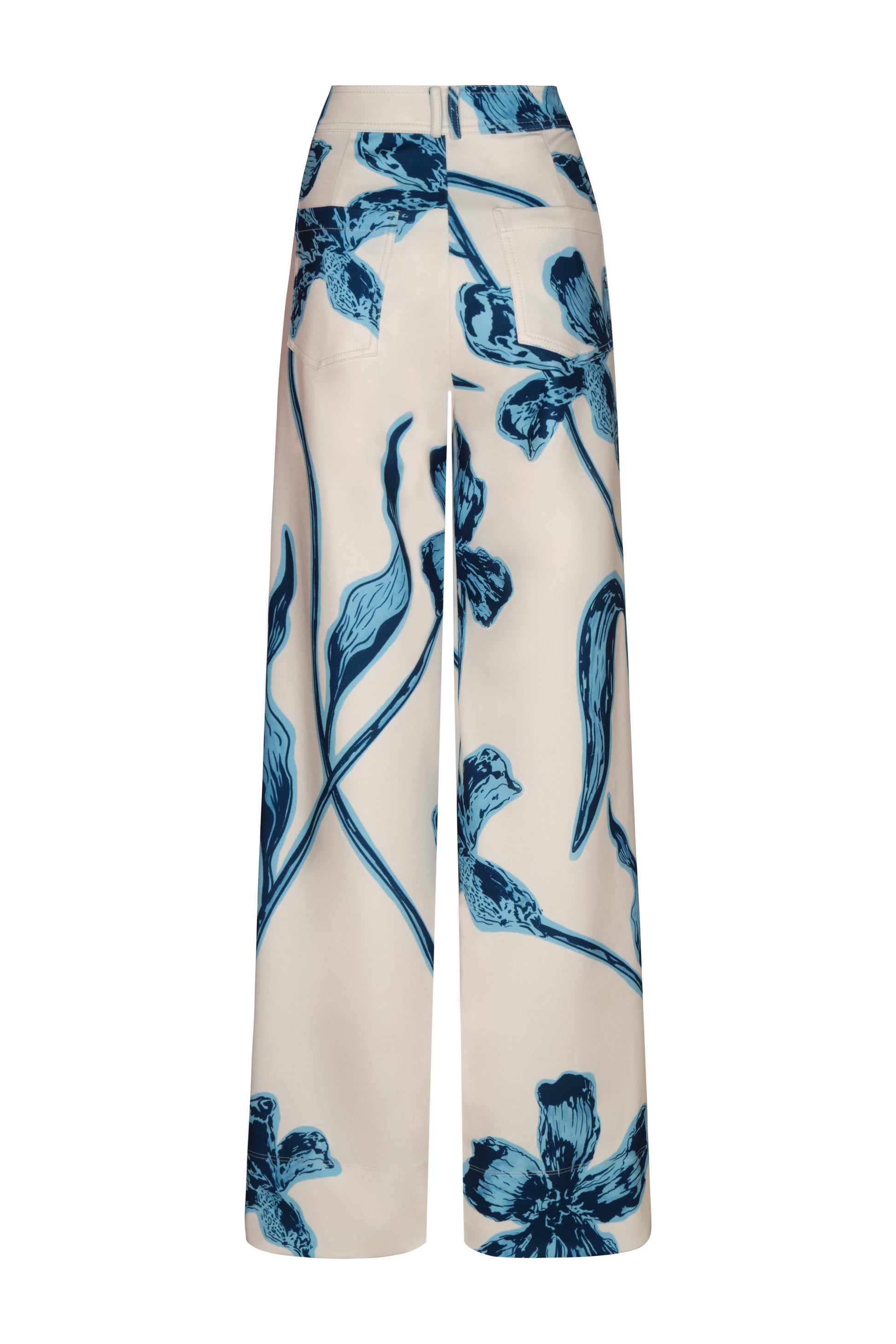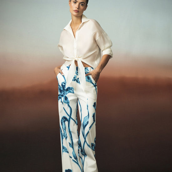 Mírame Mucho is a scuba pant adorned with Blue Lilies that ascend its structure, transforming the silhouette into a subtle work of art. A piece that blends strength with delicate elegance.