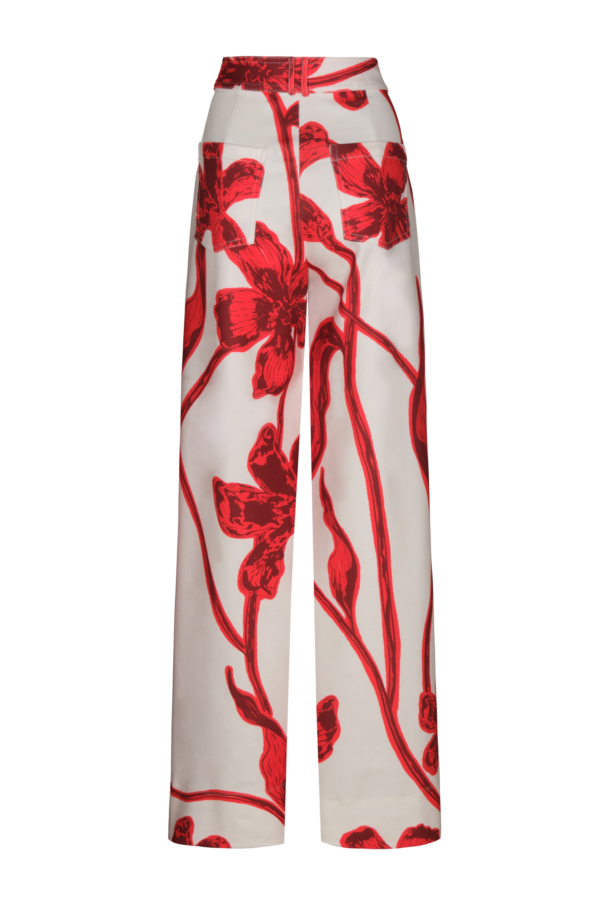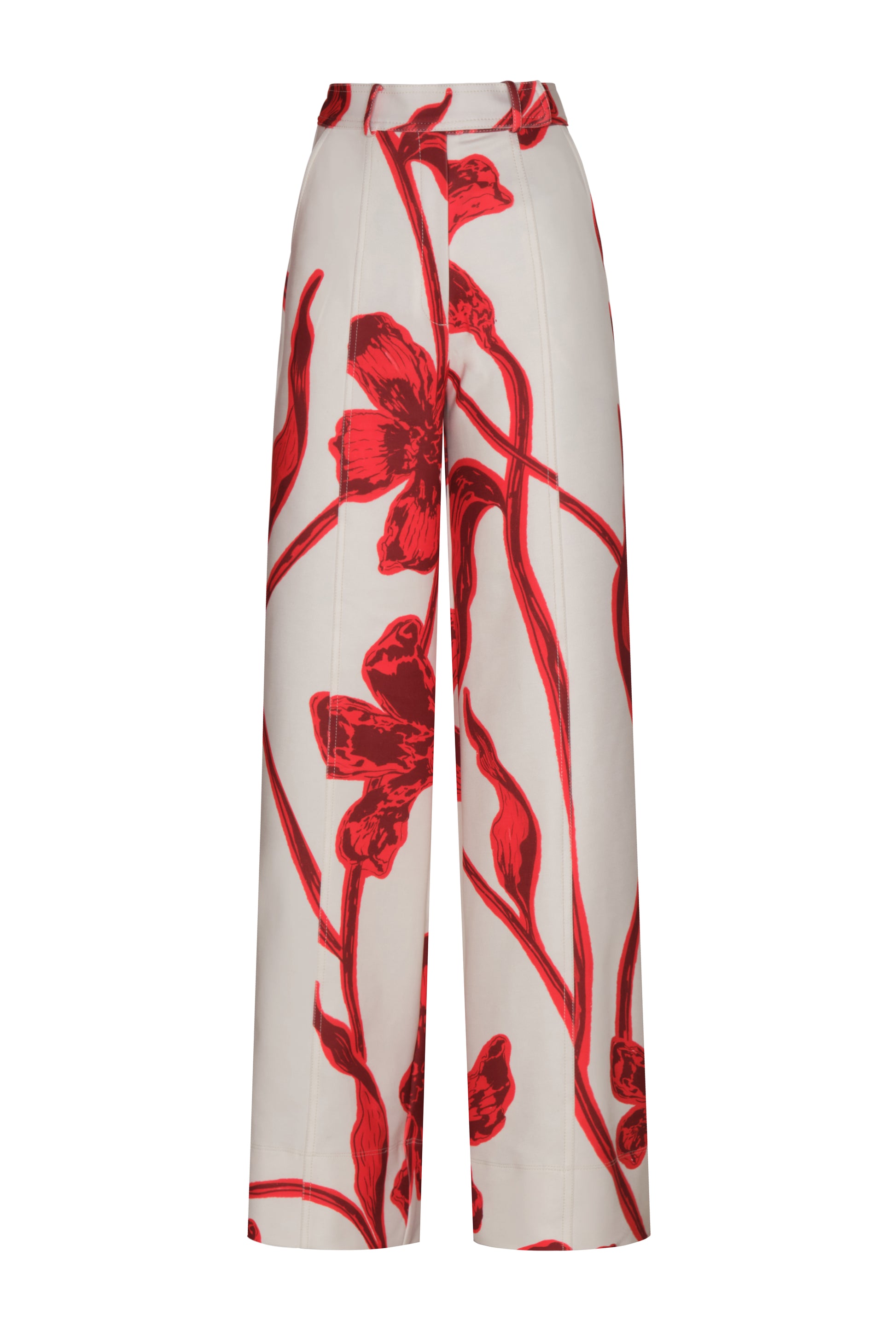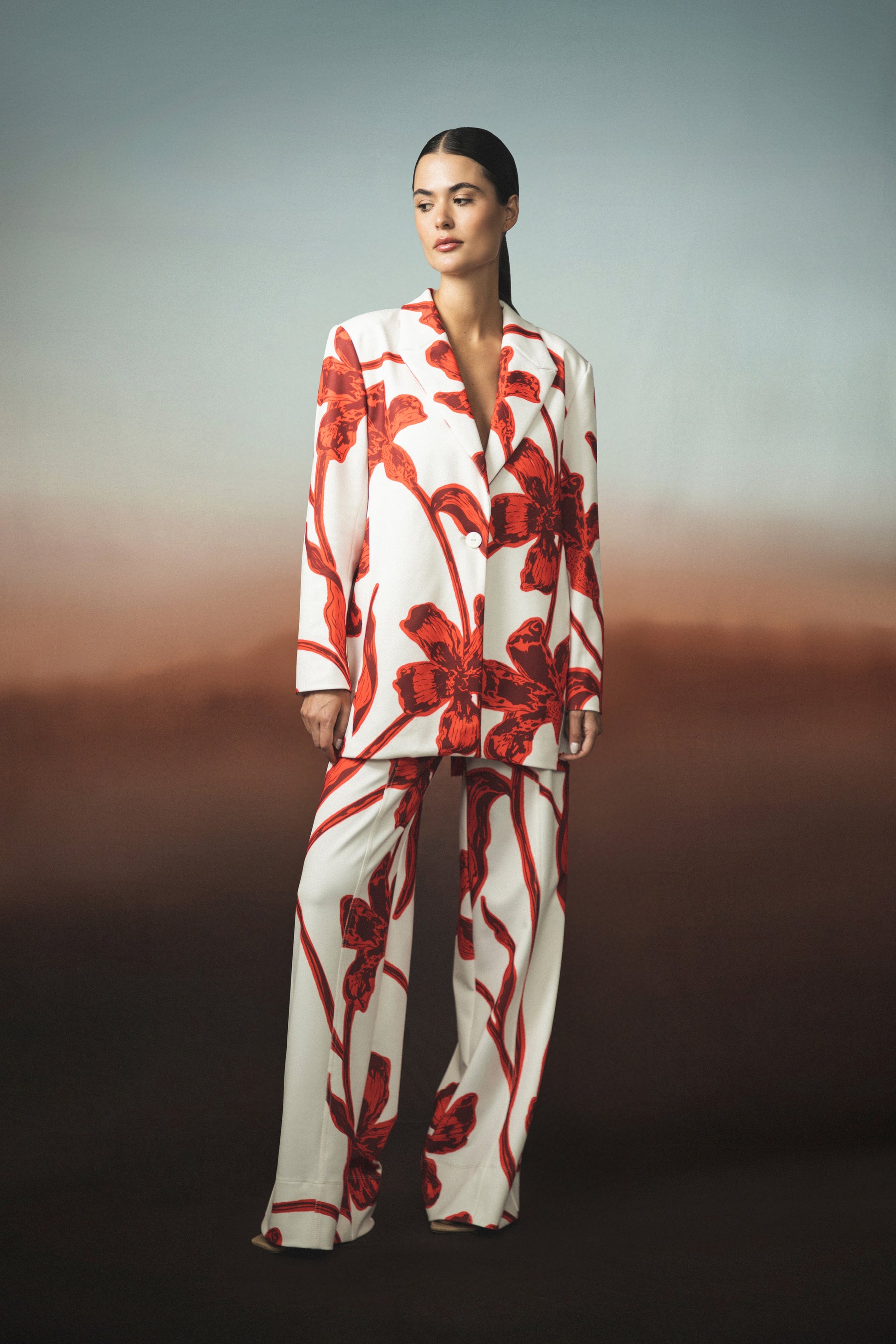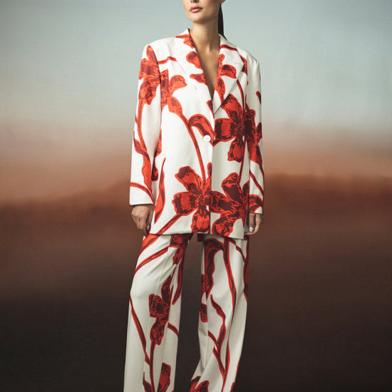 Mírame Mucho is a scuba pant adorned with Red Lilies that ascend its structure, transforming the silhouette into a subtle work of art. A piece that blends strength with delicate elegance.