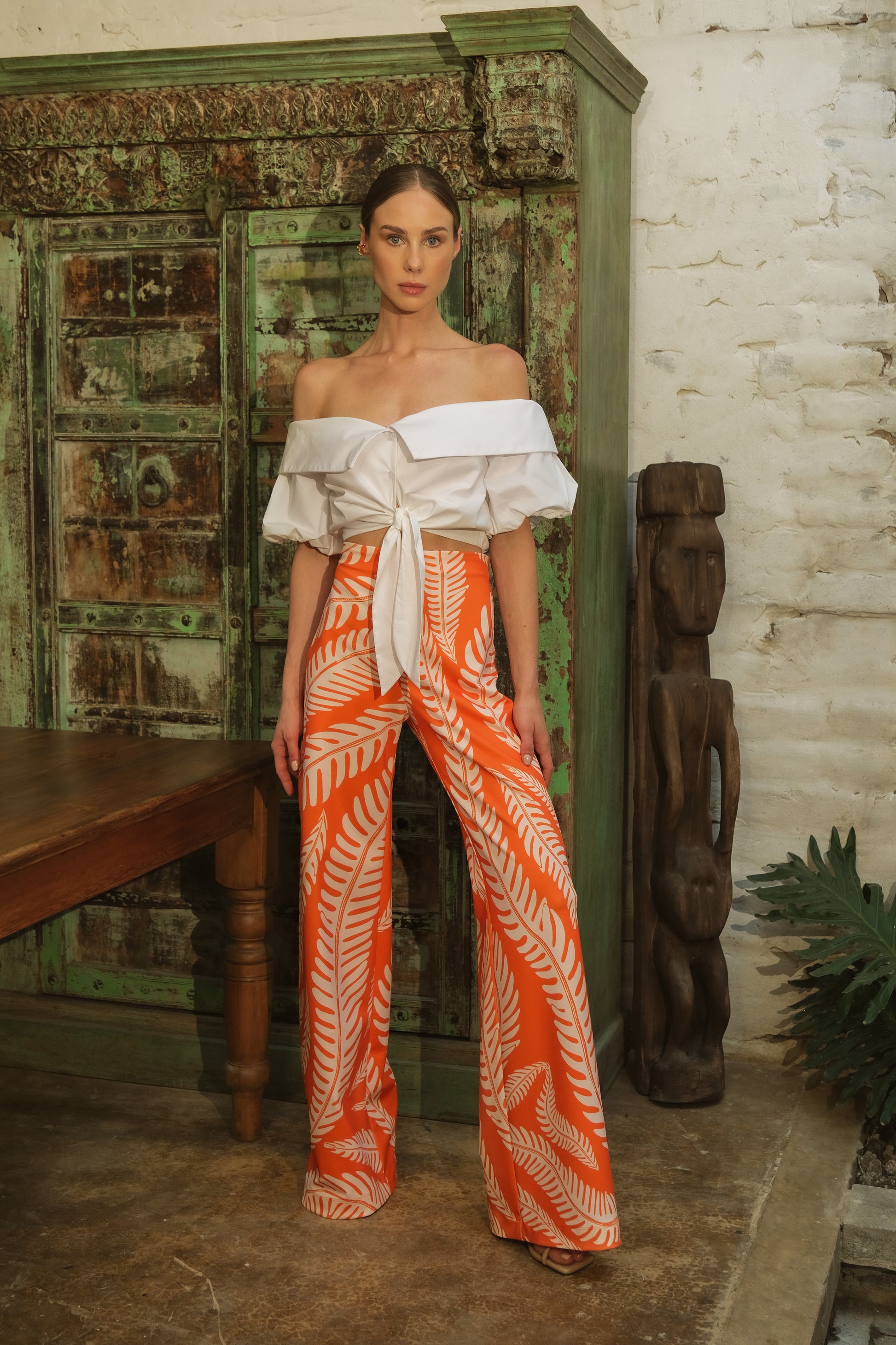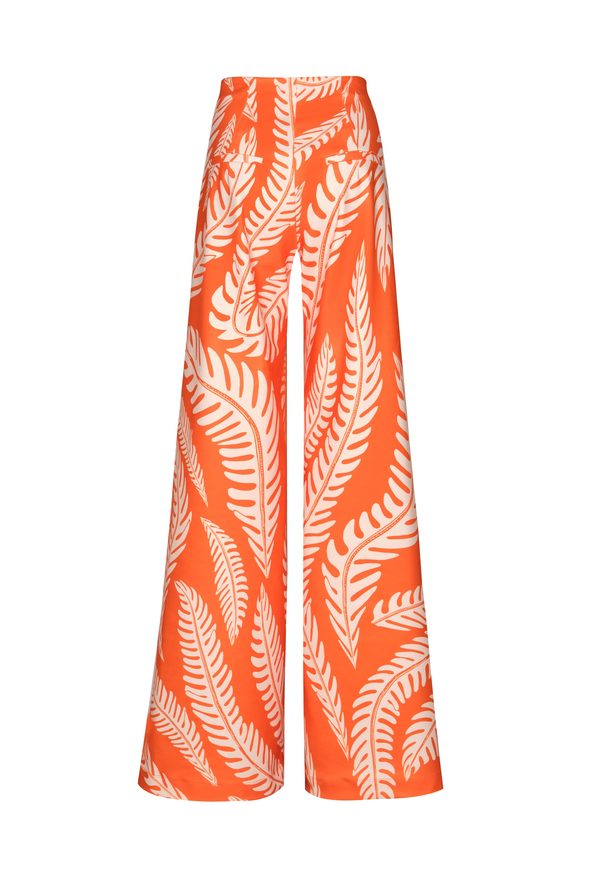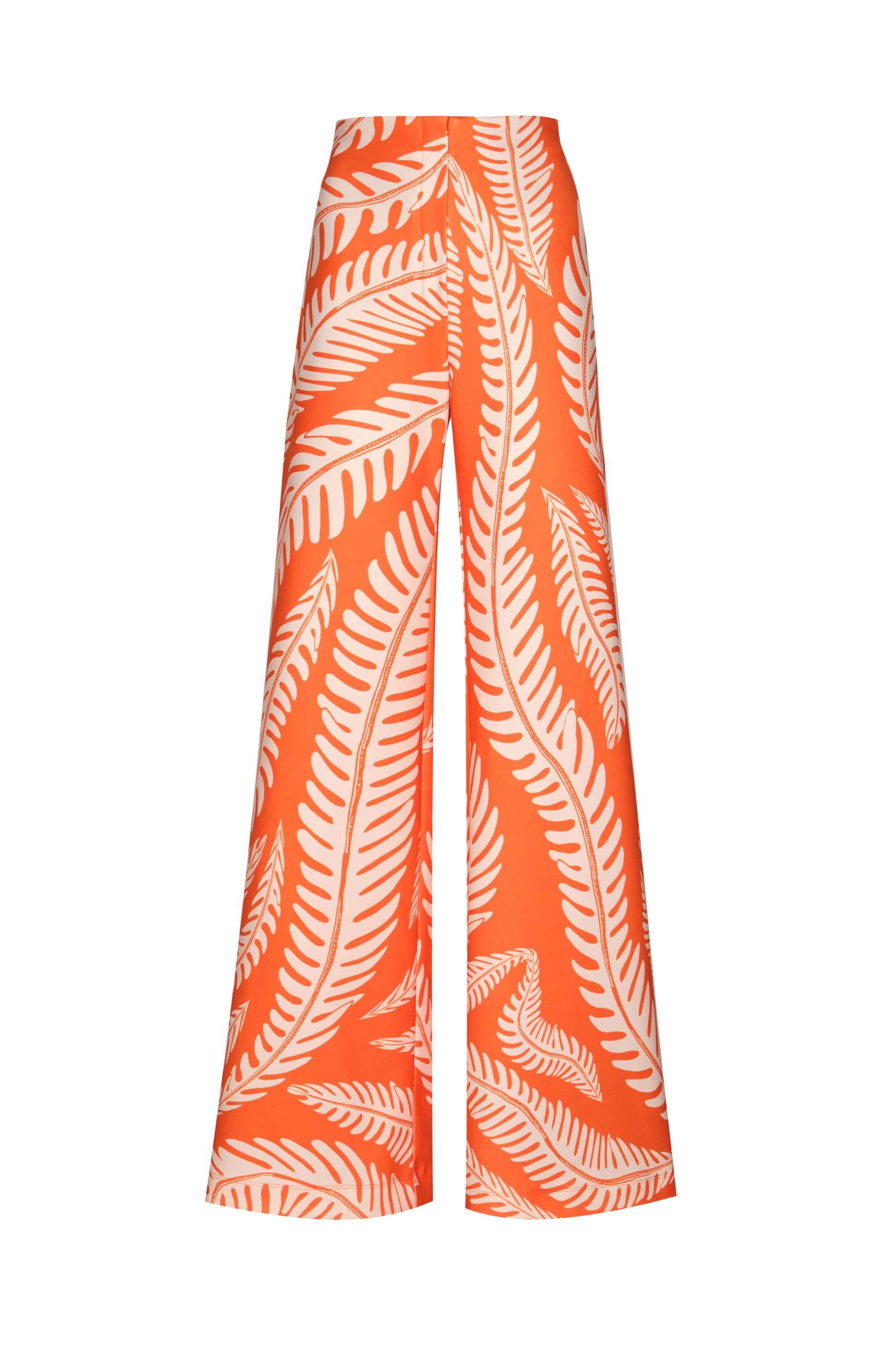 Morena, scuba pant with a vibrant Orange Fern print, crafted with a touch of spandex for comfort and flexibility. Its versatile and flattering design blends ease of movement with a bold, tropical charm.