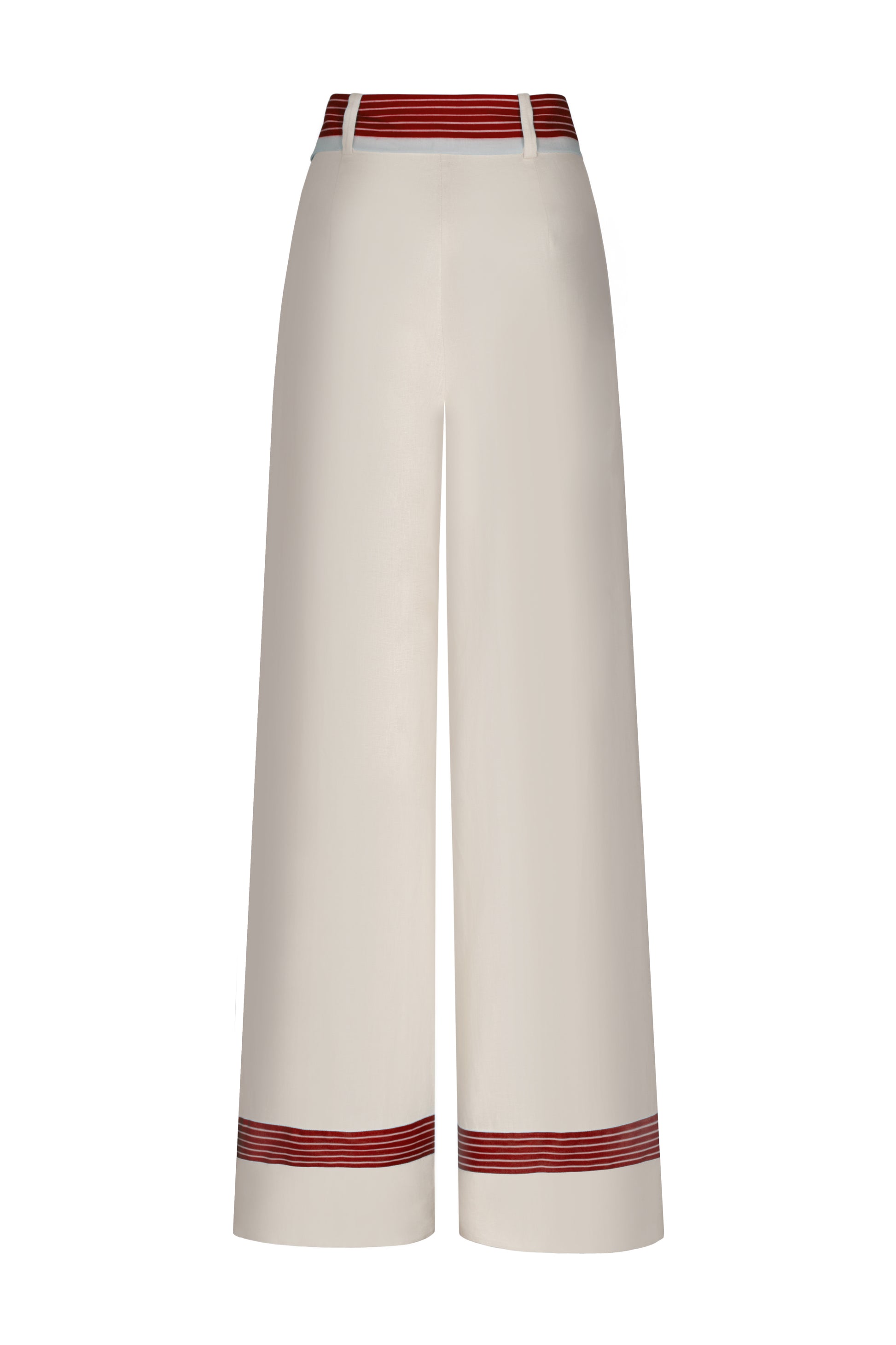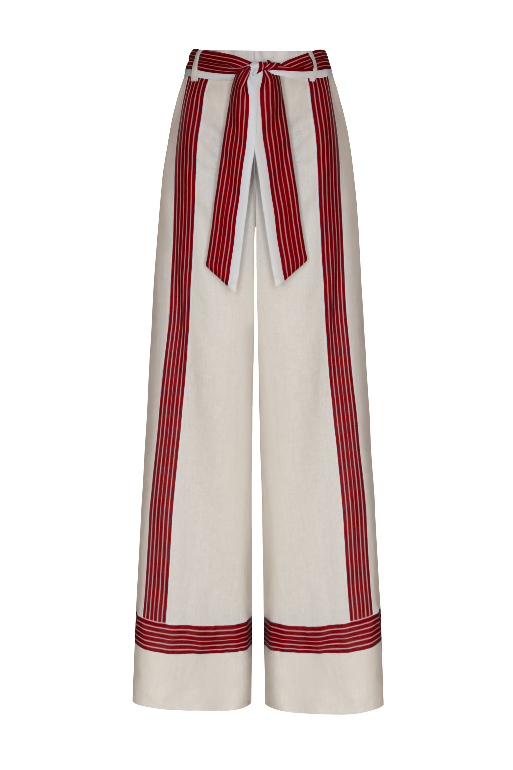 Ritmo Noble is a Wine pinstripe pant crafted from pure linen. Its belt adds a refined accent to the piece, while delicate details elevate the silhouette with quiet sophistication.