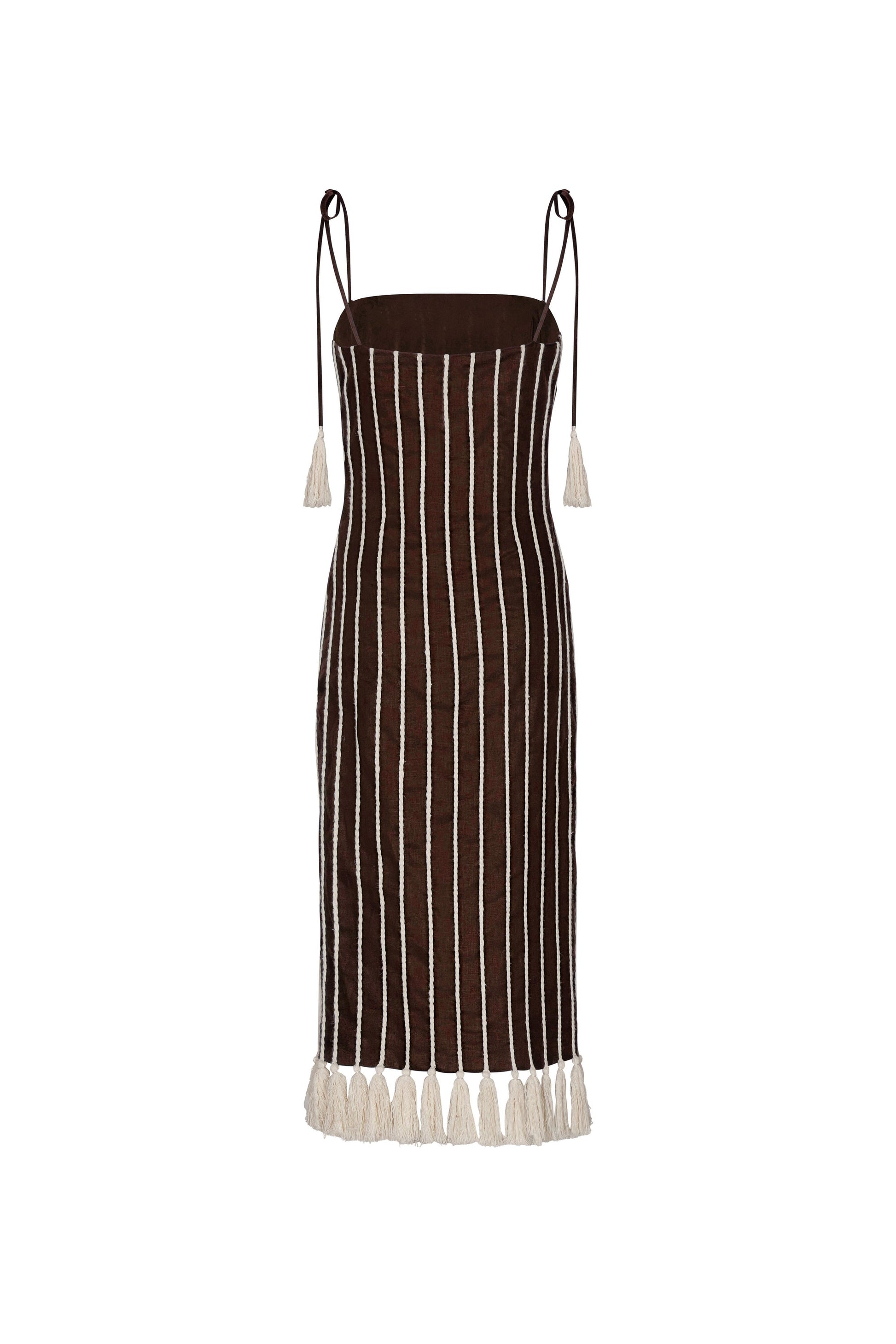 Embroidered midi dress in 100% linen, a refined design that blends Mocha vertical lines with delicate artisanal details at the hem. Its elongated silhouette and adjustable tassel straps evoke natural elegance and contemporary sophistication.