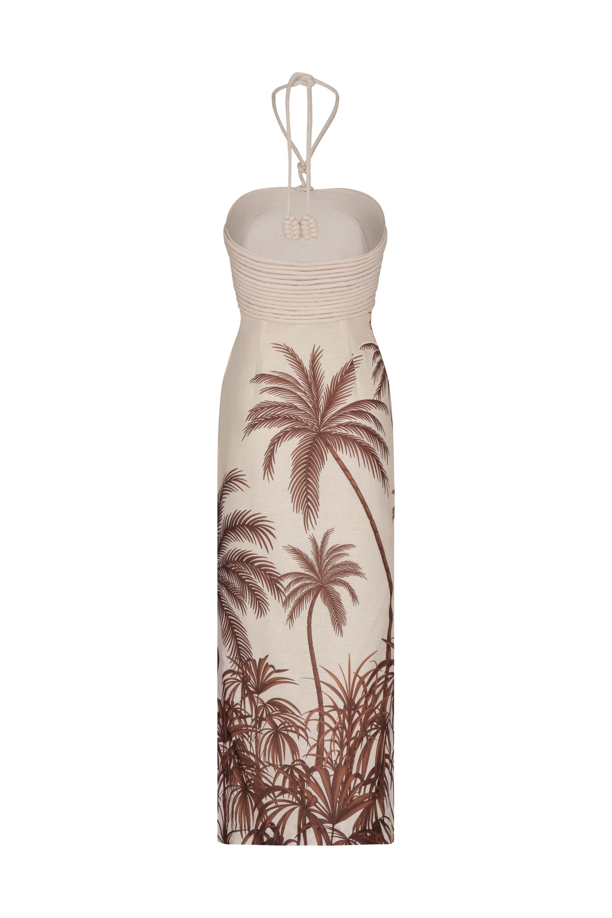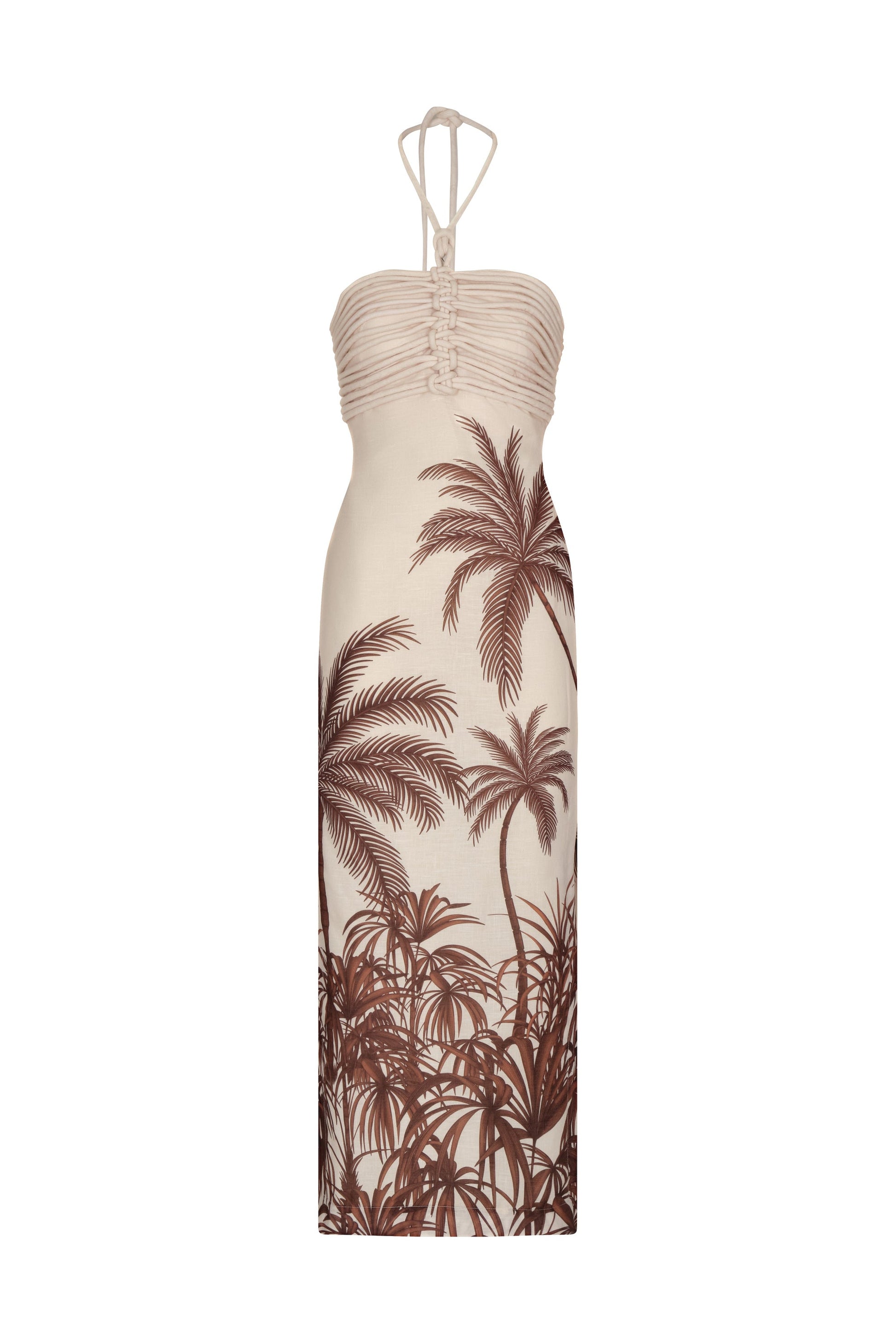 Midi dress crafted in 100% linen, featuring a sophisticated design with delicate ruching at the bodice and an evocative palm tree print in Mocha Paradiso. Its sleek silhouette and halter neckline detail make it a versatile and elegant piece