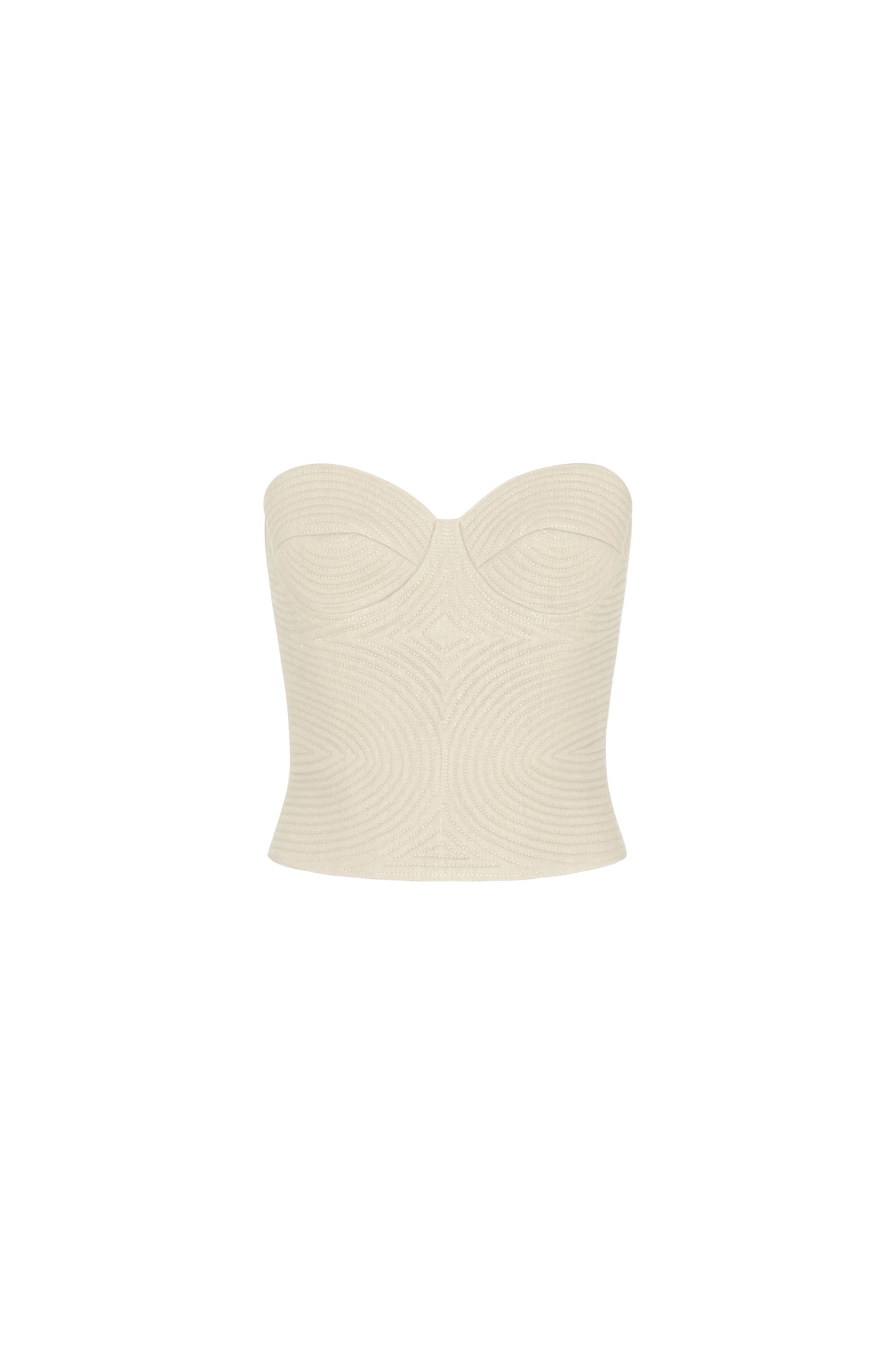 Embroidered top in ivory, crafted in linen. Inspired by the warm tones of the earth and the Caribbean sea, this simple yet elegant design stands out naturally on any occasion.