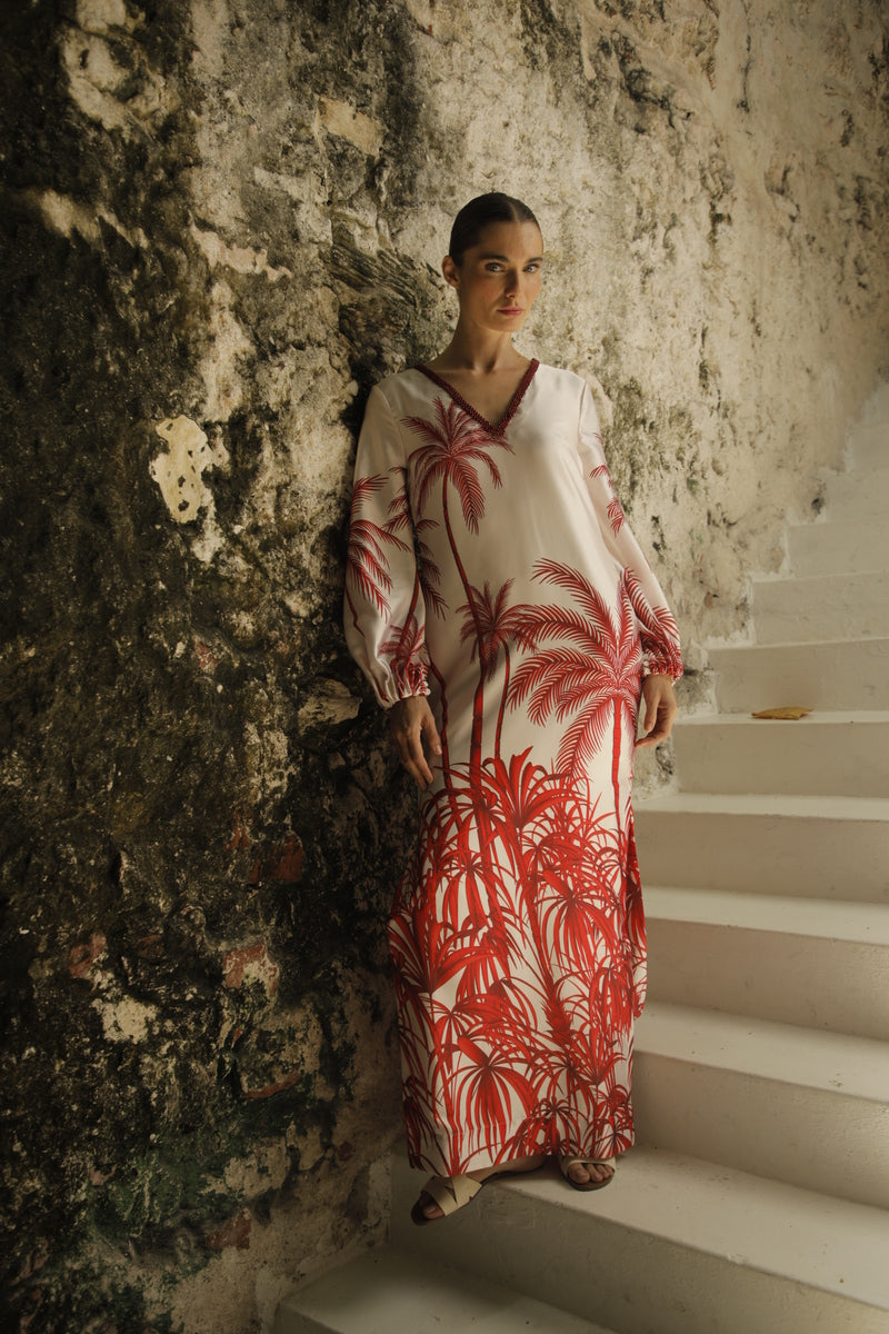 “Palmas” es una túnica ligera en tonos rojos, inspirada en la serenidad del Caribe y la belleza de sus paisajes tropicales. Un diseño fluido que transmite frescura y elegancia natural, ideal para una mujer libre y moderna.