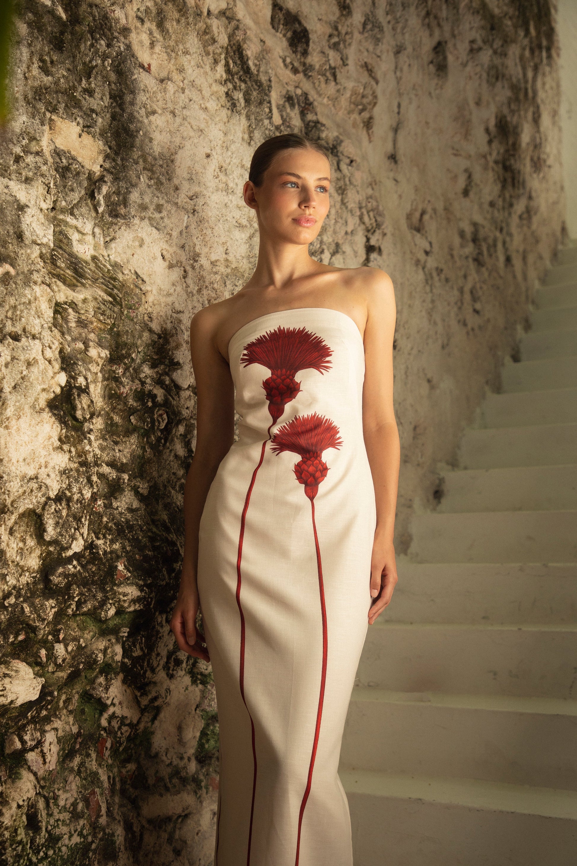 “Costera” es un vestido strapless con flores rojas bordadas, inspirado en la serenidad del mar y la belleza natural del Caribe. Una pieza elegante y atemporal que realza la feminidad con frescura y simplicidad.