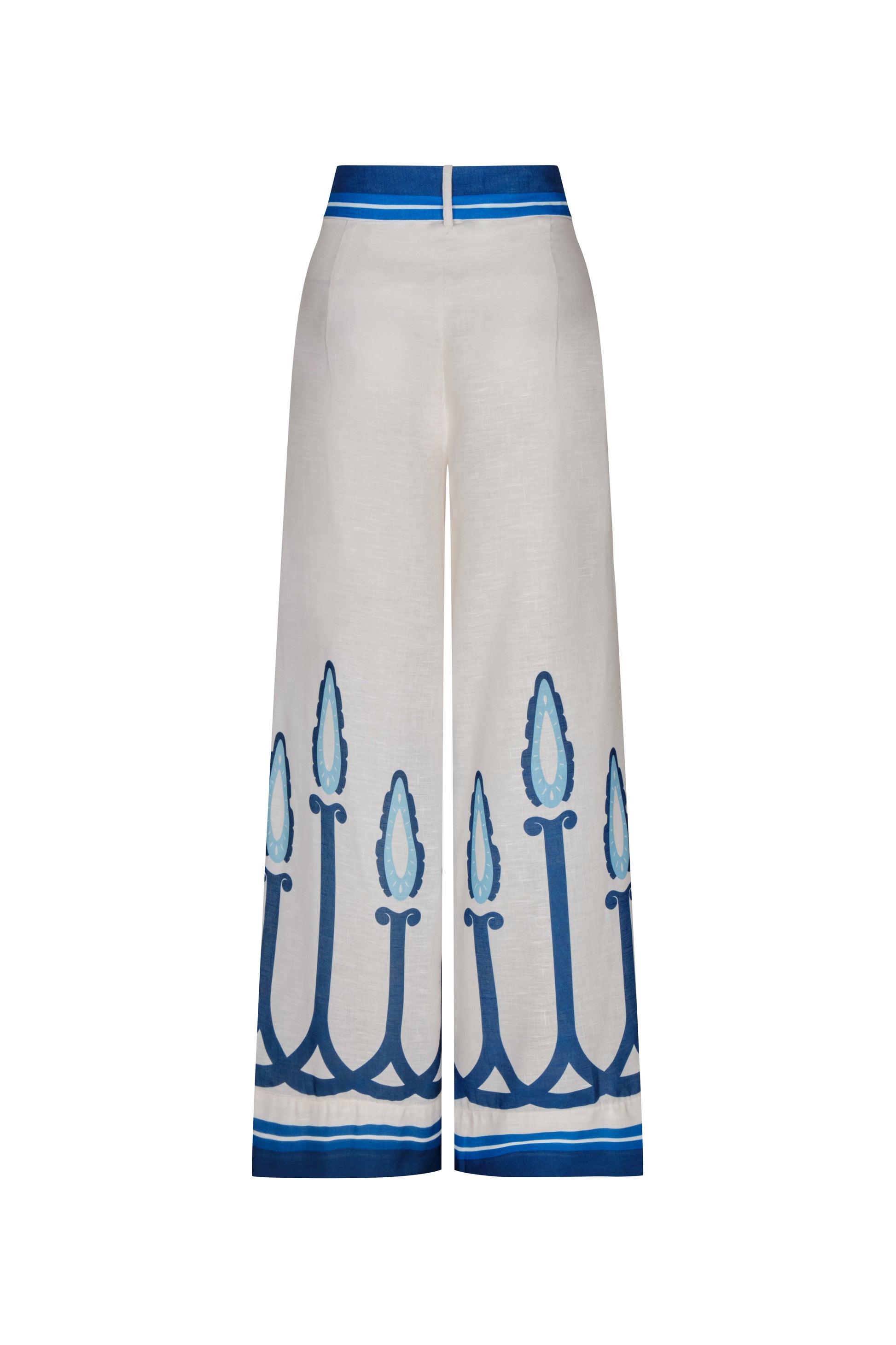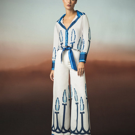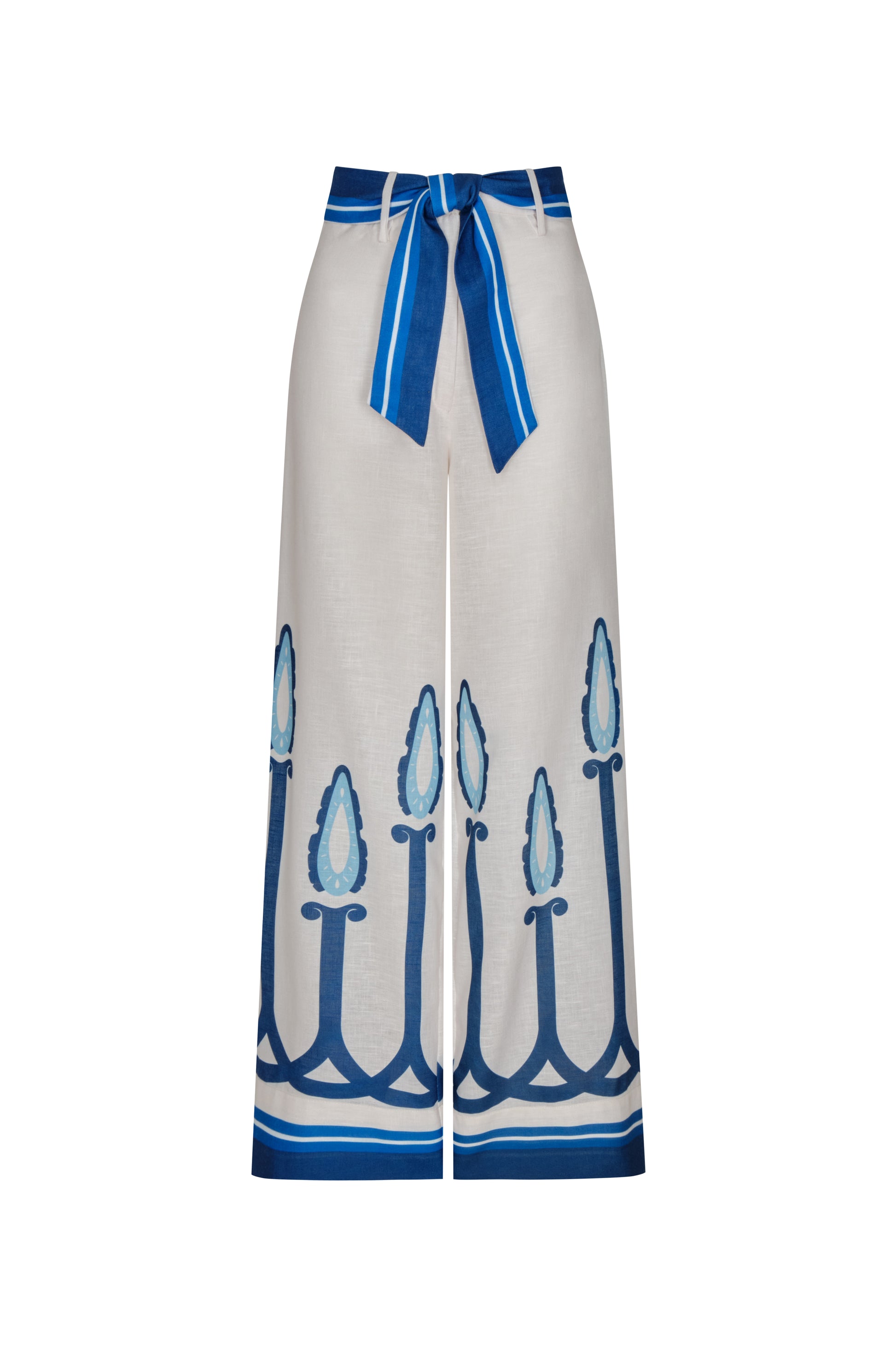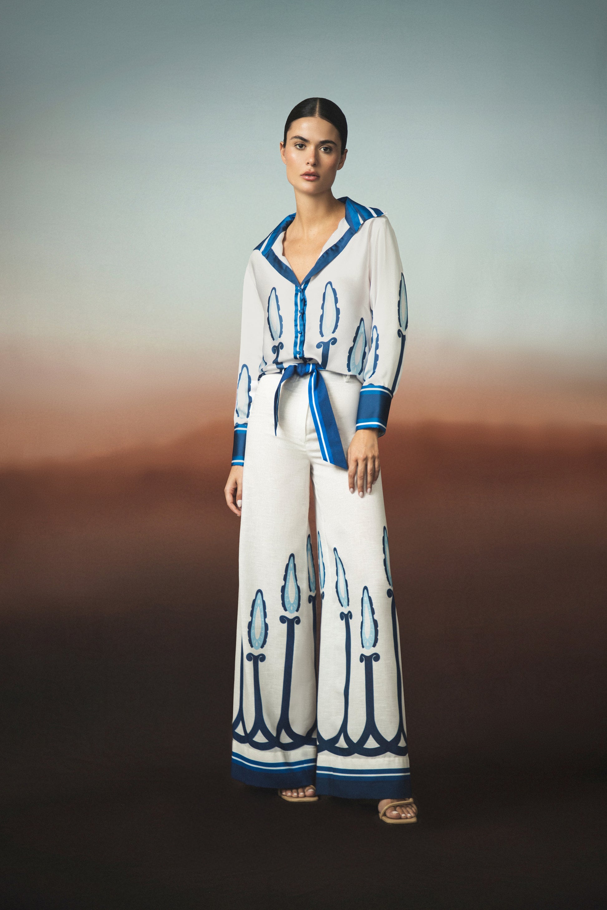 Susurro Ancestral: Pant with belt made from 100% linen. The Orange Torches print runs through the garment like a ceremony of ancient shapes and vibrant lines. A piece of subtle presence and timeless spirit.