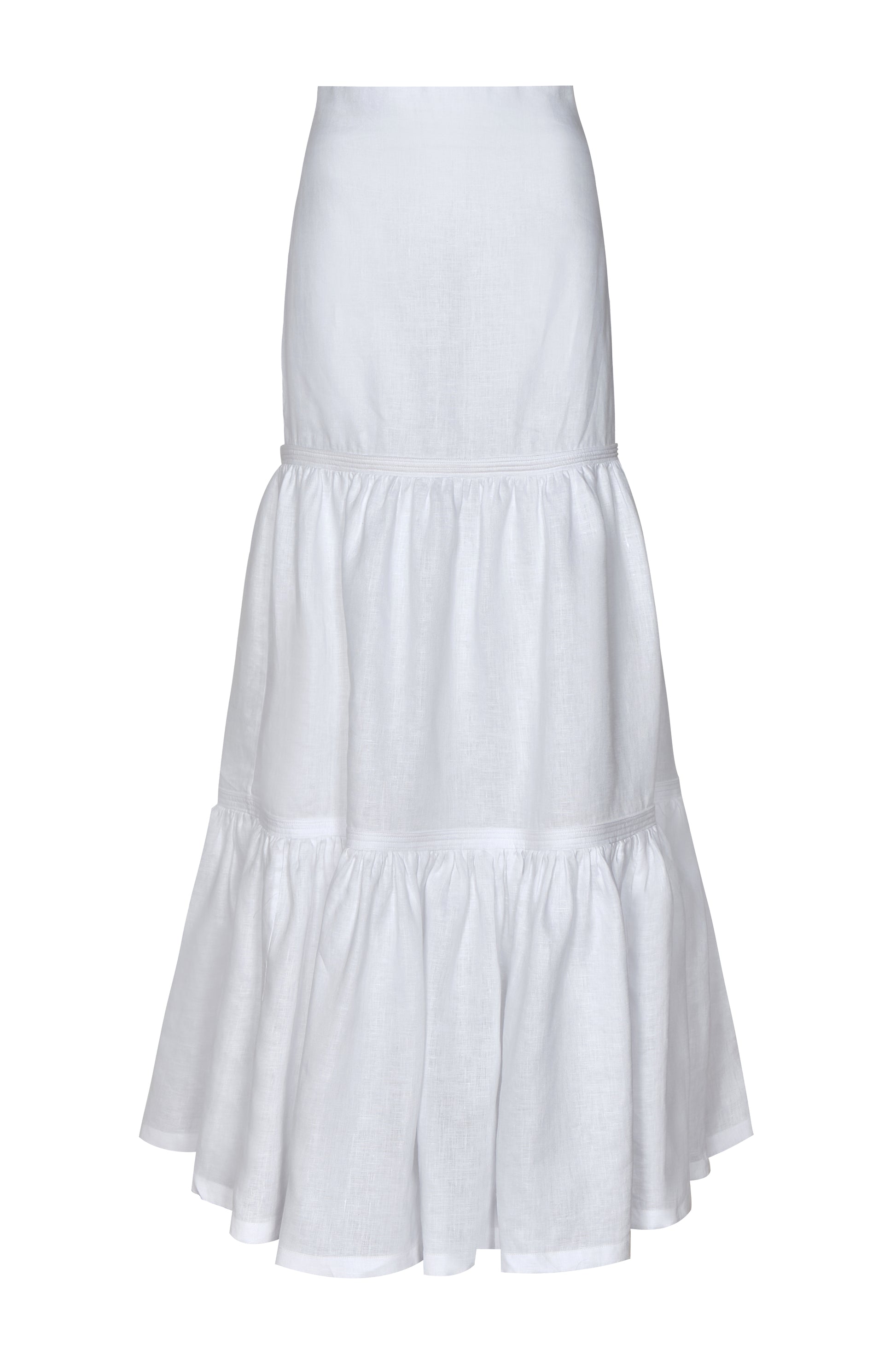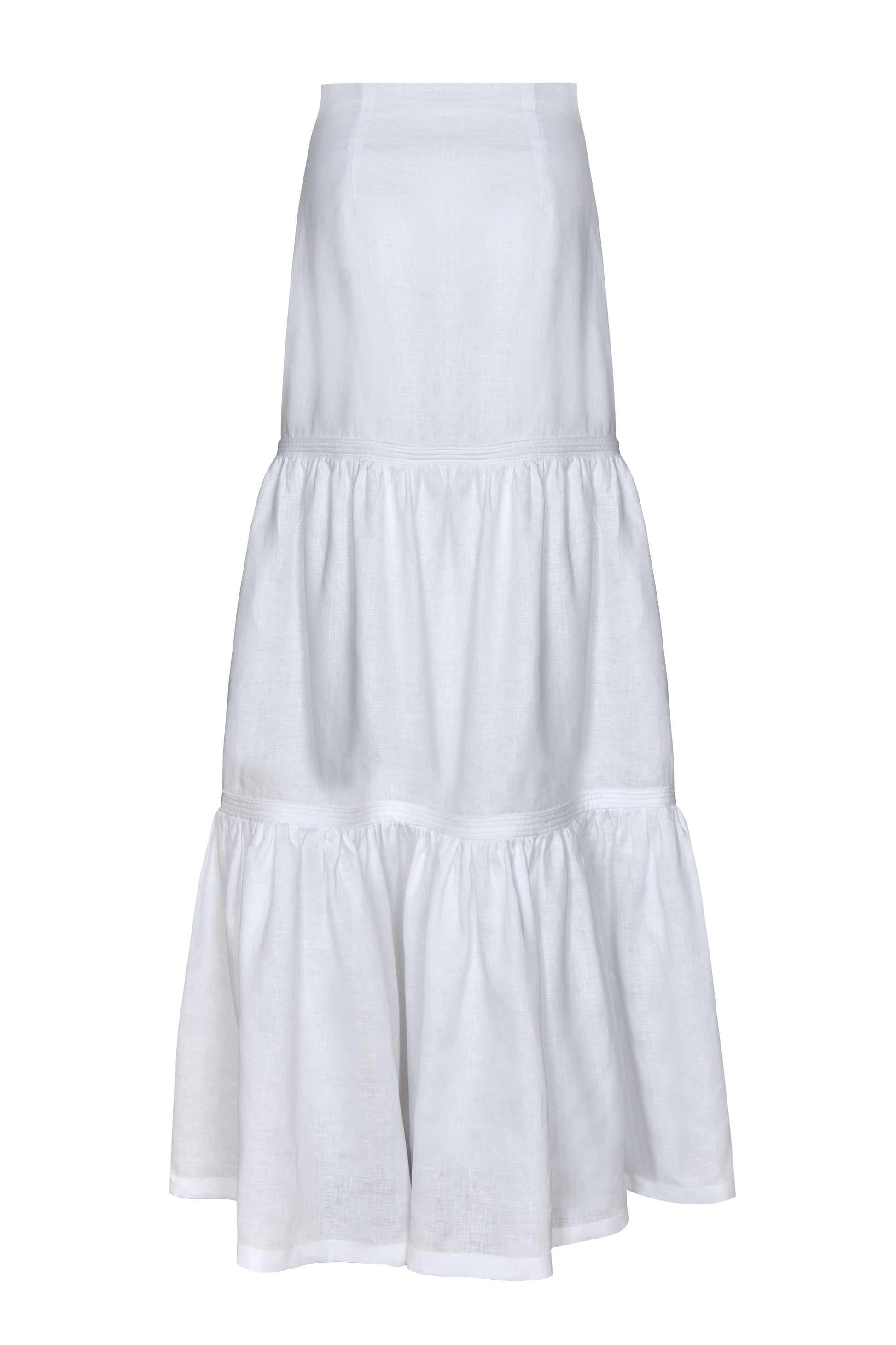 Venecia is a 100% linen maxi skirt in Off-White, designed with tiered panels for graceful movement — a fresh and feminine piece perfect for effortless summer elegance.