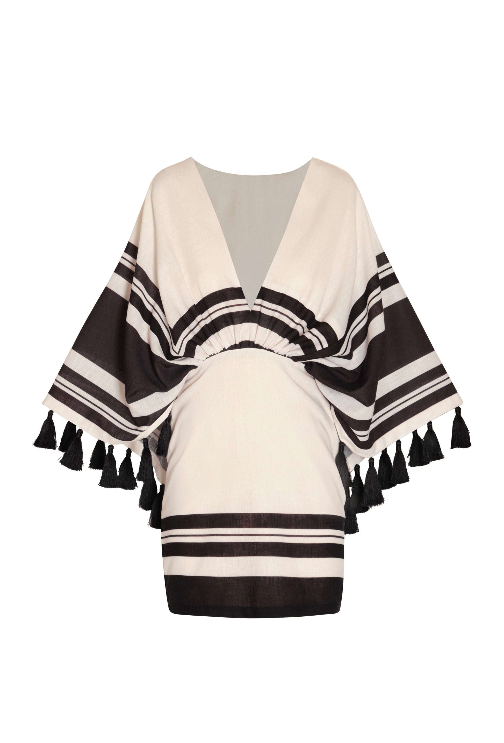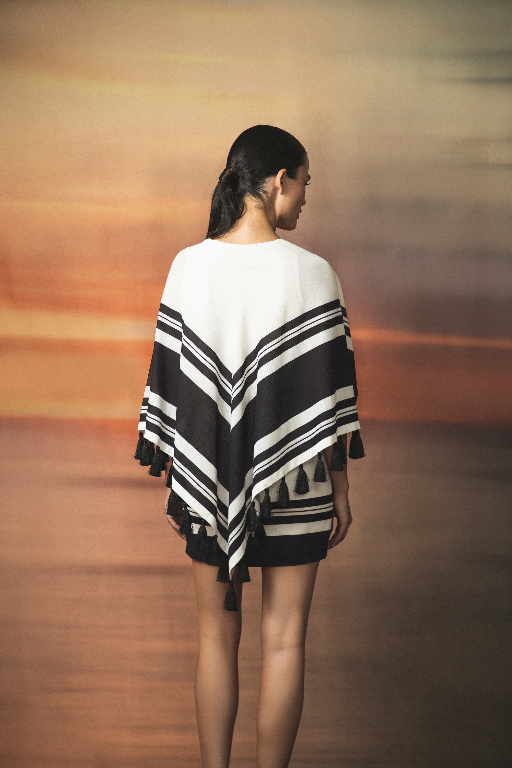 Viento Suave is a mini dress that plays with ivory and black tones, evoking the fleeting beauty of the ephemeral. Its delicate silhouette flows with ease, while the sleeves add a distinctive touch, making it a piece both subtle and unique.