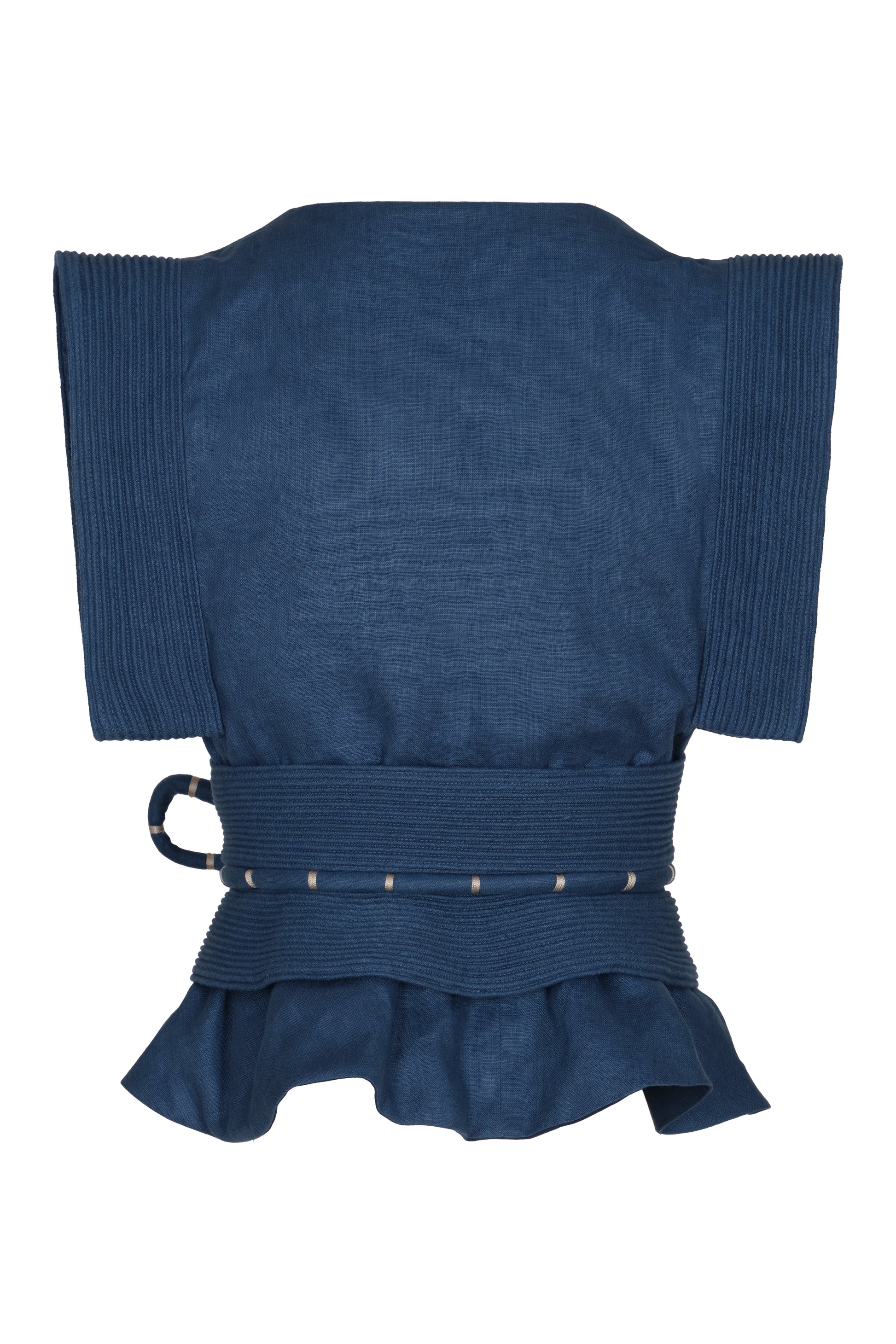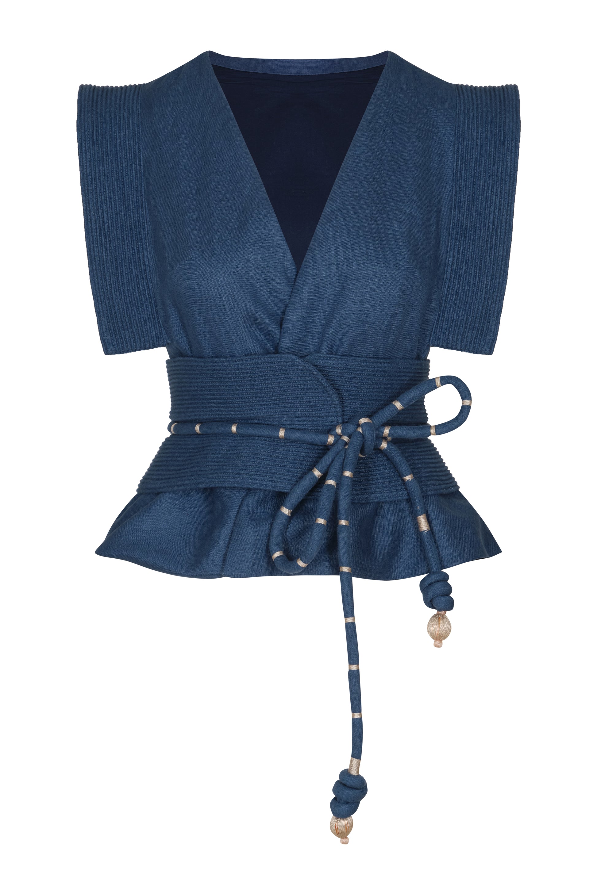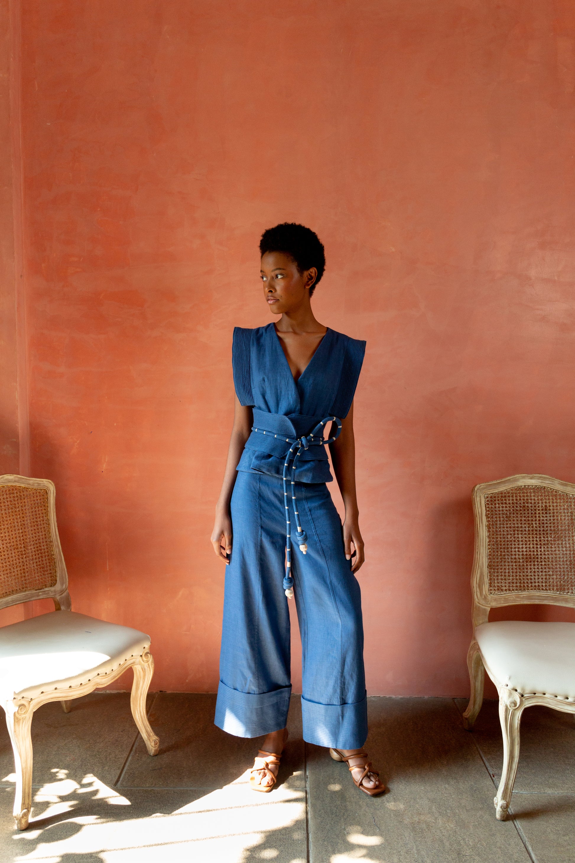 Villa de Leyva is a cobalt blue vest in 100% linen, designed with a flattering V-neckline and an attached belt that defines the waist. A versatile piece that balances structure and femininity, perfect for both polished and relaxed looks.